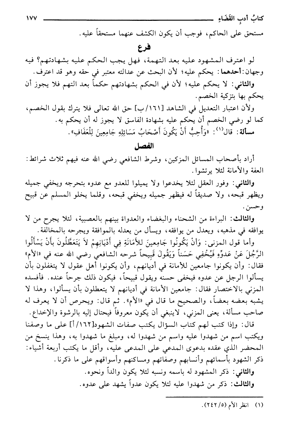 وأما قول المزني: وَأنْ يَكُونُوا جَامِعينَ للأَمَانَةِ فِي أَدْيَانِهِمْ لاَ يَتَعَطَّلُونَ بأَنْ يَسْأَلُوا الرَّجُلَ عَنْ عَدوِّهِ فَيُخْفِي حَسَنًا وَيَقُولَ قَبِيحًا شرحه الشافعي رضي الله عنه في "الأم" فقال: وأن يكونوا جامعين للأمانة في أديانهم, وأن يكونوا أهل عقول لا يتغفلون بأن يسألوا الرجل عن عدوه فيخفي حسنه ويقول قبيحًا, فيكون ذلك جرحًا عنده. فأفسده المزني بالاختصار فقال: جامعين الأمانة في أديانهم لا يتعطلون بأن يسألوا, وهذا لا يشبه بعضه بعضًا, والصحيح ما قال في "الأم". ثم قال: ويحرص أن لا يعرف له صاحب مسألة, يعني المزني, لا ينبغي أن يكون معروفًا فيحتال إليه بالرشوة والإخداع.
