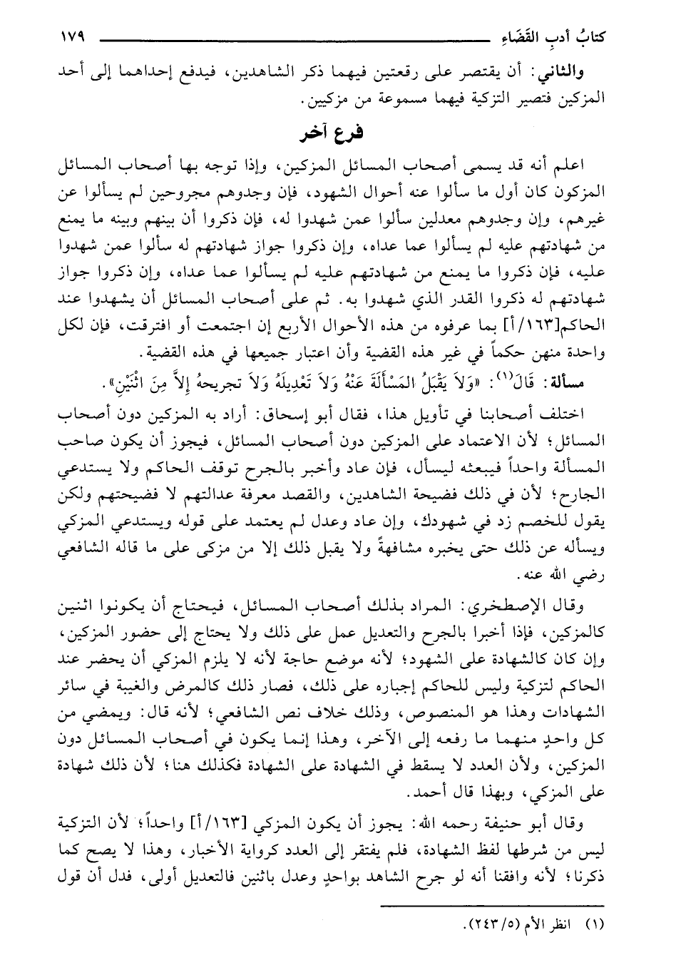 وقال الإصطخري: المراد بذلك أصحاب المسائل, فيحتاج أن يكونوا اثنين كالمزكين, فإذا أخبرا بالجرح والتعديل عمل على ذلك ولا يحتاج إلى حضور المزكين, وإن كان كالشهادة على الشهود؛ لأنه موضع حاجة لأنه لا يلزم المزكي أن يحضر عند الحاكم لتزكية وليس للحاكم إجباره على ذلك, فصار ذلك كالمرض والغيبة في سائر الشهادات وهذا هو المنصوص, وذلك خلاف نص الشافعي؛ لأنه قال: ويمضي من كل واحدٍ منهما ما رفعه إلى الآخر, وهذا إنما يكون في أصحاب المسائل دون المزكين, ولان العدد لا يسقط في الشهادة على الشهادة فكذلك هنا؛ لأن ذلك شهادة على المزكي, وبهذا قال أحمد.