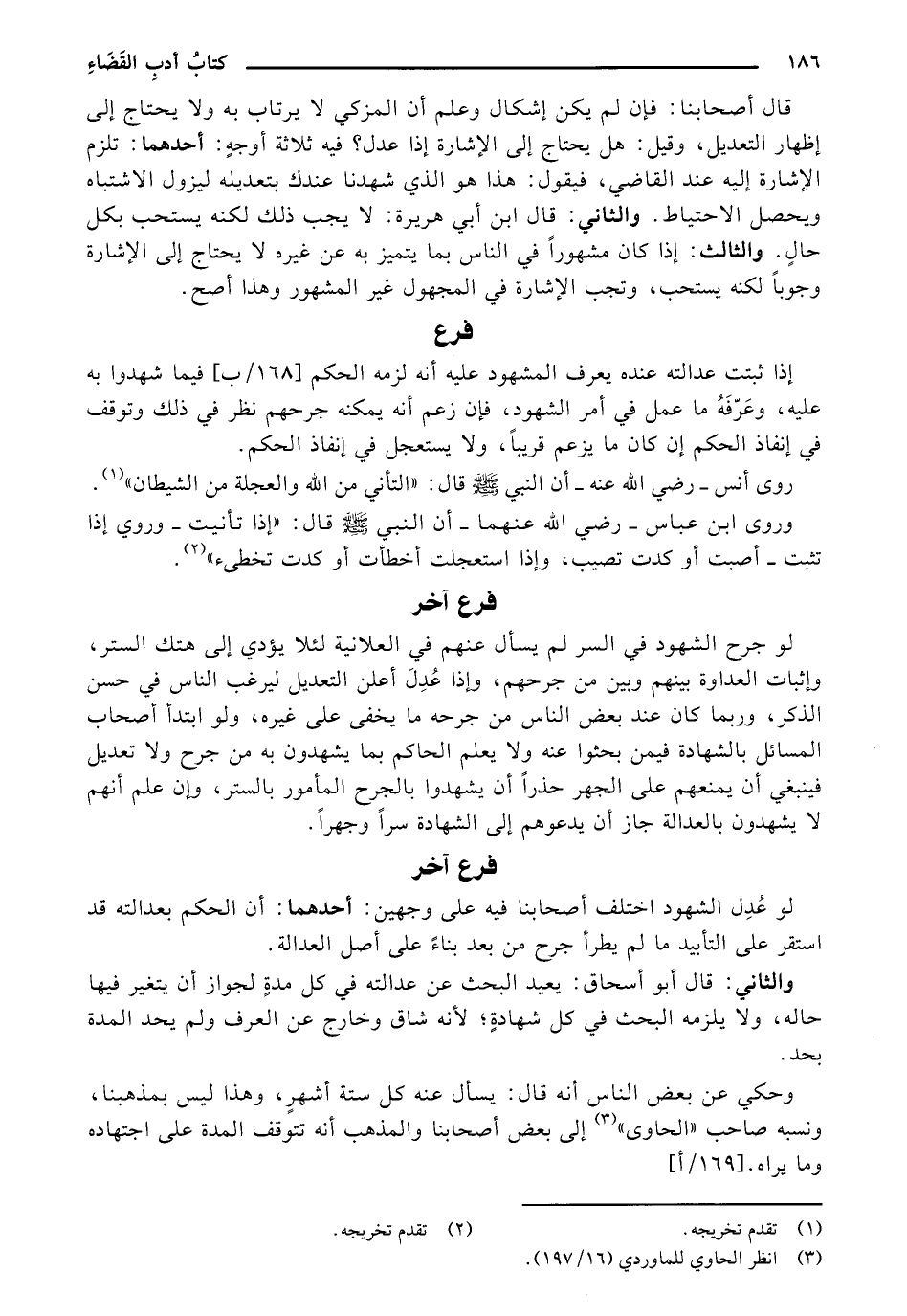 لو جرح الشهود في السر لم يسأل عنهم في العلانية لئلا يؤدي إلى هتك الستر، وإثبات العداوة بينهم وبين من جرحهم، وإذا عدل أعلن التعديل ليرغب الناس في حسن الذكر، وربما كان عند بعض الناس من جرحه ما يخفي على غيره، ولو ابتدأ أصحاب المسائل بالشهادة فيمن بحثوا عنه ولا يعلم الحاكم بما يشهدون به من جرح ولا تعديل فينبغي أن يمنعهم على الجهر حذراً أن يشهدوا بالجرح المأمور بالستر، وإن علم أنهم لا يشهدون بالعدالة جاز أن يدعوهم إلى الشهادة سراً وجهراً.