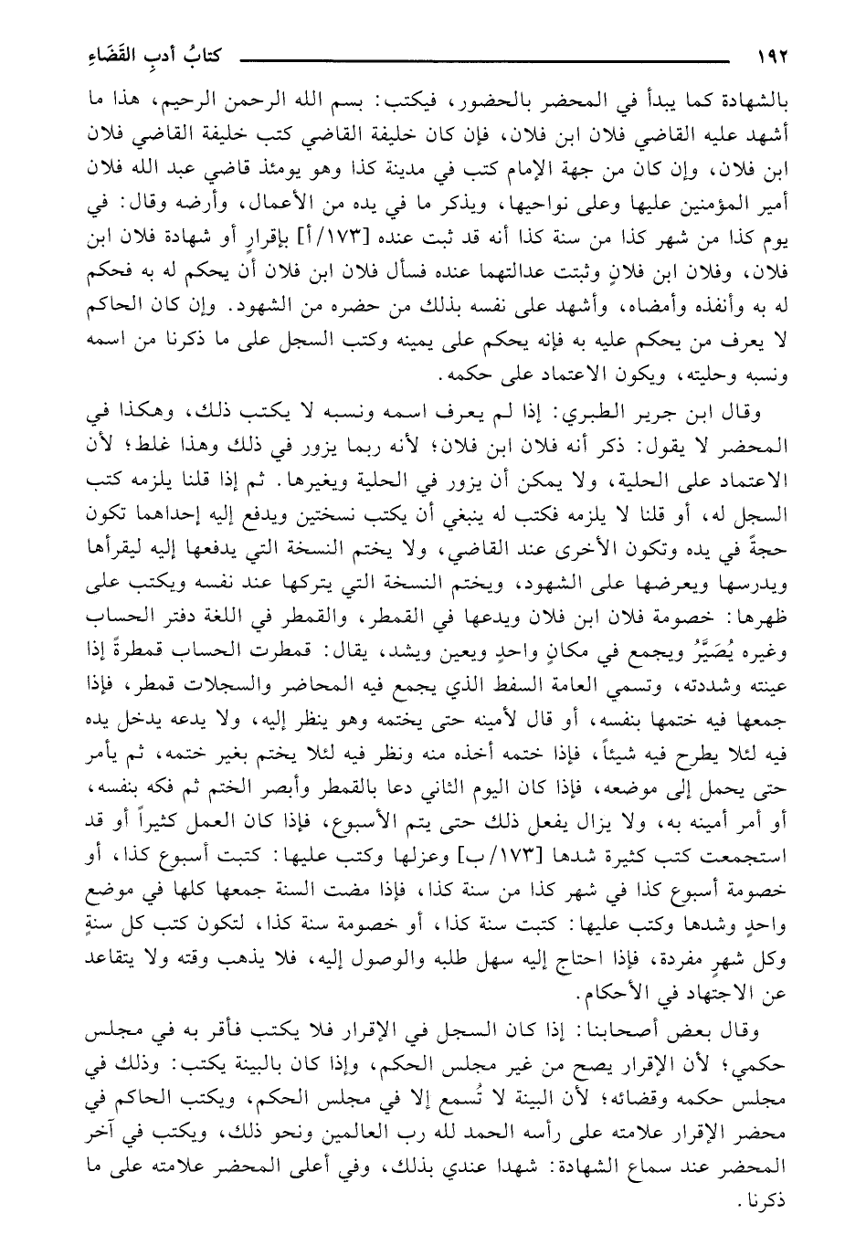 وقال بعض أصحابنا: إذا كان السجل في الإقرار فلا يكتب فأقر به في مجلس حكمي؛ لأن الإقرار يصح من غير مجلس الحكم، وإذا كان بالبينة يكتب: وذلك في مجلس حكمه وقضائه؛ لأن البينة لا تُسمع إلا في مجلس الحكم، ويكتب الحاكم في محضر الإقرار علامته على رأسه الحمد لله رب العالمين ونحو ذلك، ويكتب في آخر المحضر عند سماع الشهادة: شهدا عندي بذلك، وفي أعلى المحضر علامته على ما ذكرنا.