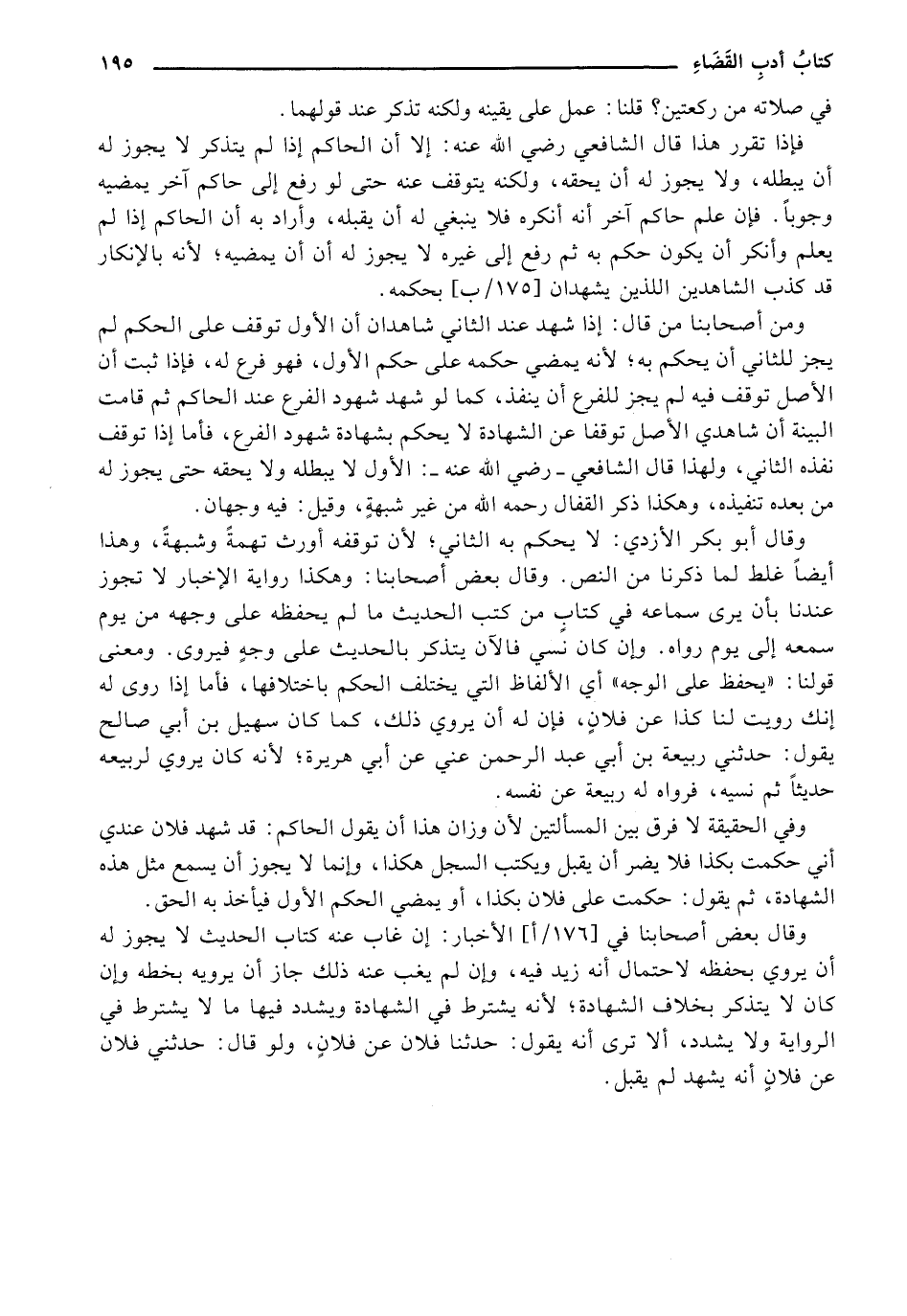 وقال أبو بكر الأزدي: لا يحكم به الثاني؛ لأن توقفه أورث تهمةً وشبهةً، وهذا أيضًا غلط لما ذكرنا من النص. وقال بعض أصحابنا: وهكذا رواية الإخبار لا تجوز عندنا بأن يرى سماعه في كتابٍ من كتب الحديث ما لم يحفظه على وجهه من يوم سمعه إلى يوم رواه. وإن كان نسي فالآن يتذكر بالحديث على وجهٍ فيروى. ومعنى قولنا: "يحفظ على الوجه" أي الألفاظ التي يختلف الحكم باختلافها، فأما إذا روى له إنك رويت لنا كذا عن فلانٍ، فإن له أن يروي ذلك، كما كان سهيل بن أبي صالح يقول: حدثني ربيعة بن أبي عبد الرحمن عني عن أبي هريرة؛ لأنه كان يروي لربيعه حديثًا ثم نسيه، فرواه له ربيعة عن نفسه.