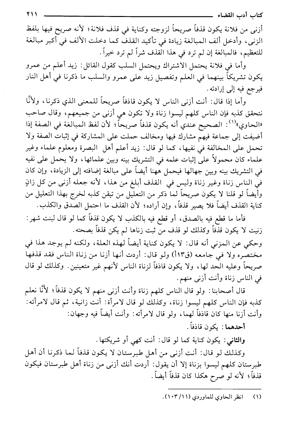 وأما إذا قال: أنت أزنى الناس لا يكون قاذفاً صريحاً للمعنى الذي ذكرنا، ولأنًا نتحقق كذبه فإن الناس كلهم ليسوا زناة ولا تكون هي أزني من جميعهم، وقال صاحب " الحاوي ": الصحيح عندي أنه يكون قذفاً صريحاً، لأن لفظ المبالغة في الصفة إذا أضيف إلى جماعة فيهم مشارك فيها ومخالف حملت علي المشاركة في إثبات الصفة ولا تحمل علي المخالفة في نفيها، كما لو قال: زيد أعلم أهل البصرة ومعلوم علماء وغير علماء كان محمولاً علي إثبات علمه في التشريك بينه وبين علمائها، ولا يحمل على نفيه في التشريك بينه وبين جهالها فيحمل ههنا أيضاً على مبالغة إضافته إلي الزيادة، وإن كان في الناس زناة وغير زناة وليس في القذف أبلغ من هذا، لأنه جعله أزنى من كل زانٍ وأيضاً لو قلنا لا يكون صريحاً لما ذكر من التعليل من تيقن كذبه لخرج بهذا التعليل من كنايه القذف أيضاً فلا يصير قذفاً، وإن أراده، لأن القذف ما احتمل الصدق والكذب.