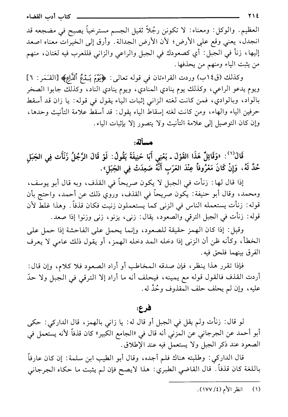 قَالَ: وقَائِلٌ هَذَا القَوْلَ - يَعْنِي أَبَا حَنيِفَةَ يَقُولُ: لو قَالَ الرَّجُلُ زَنَاَت فِي الجَبَلِ حُدَّ لَهُ، وإِنْ كَانَ مَعْرُوفاً عِنّدَ العَرَبِ أَنَّهُ صَعِدَتْ فِي الجَبَلِ ".