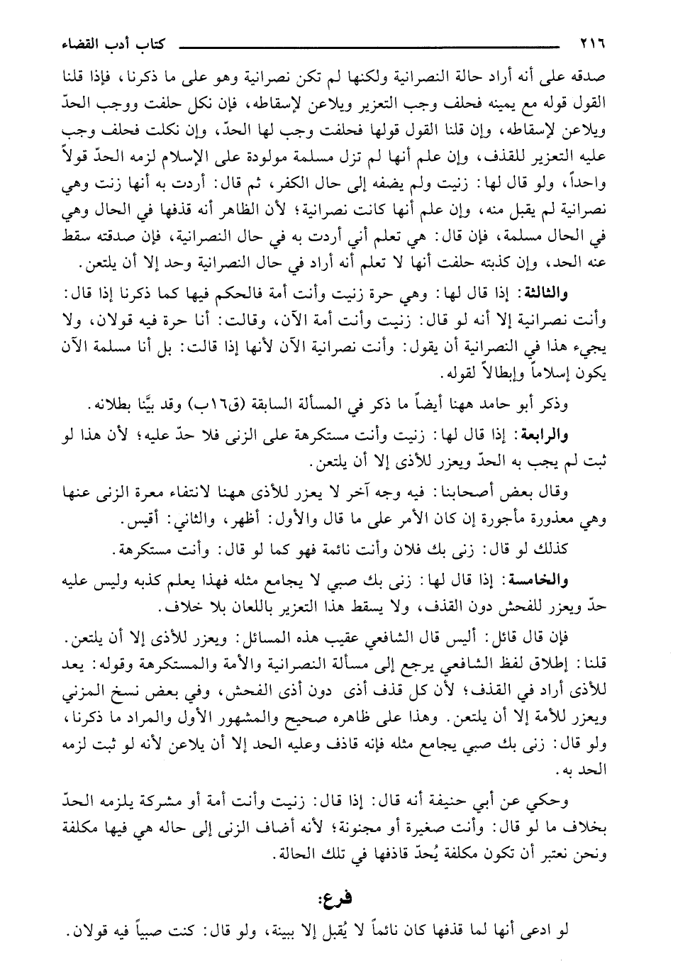وحكي عن أبي حنيفة أنه قال: إذا قال: زنيت وأنت أمه أو مشركة يلزمه الحدّ بخلاف ما لو قال: وأنت صغيرة أو مجنونة، لأنه أضاف الزني إلي حاله هي فيها مكلفه ونحن نعتبر أن تكون مكلفه يُحدّ قاذفها في تلك الحالة.