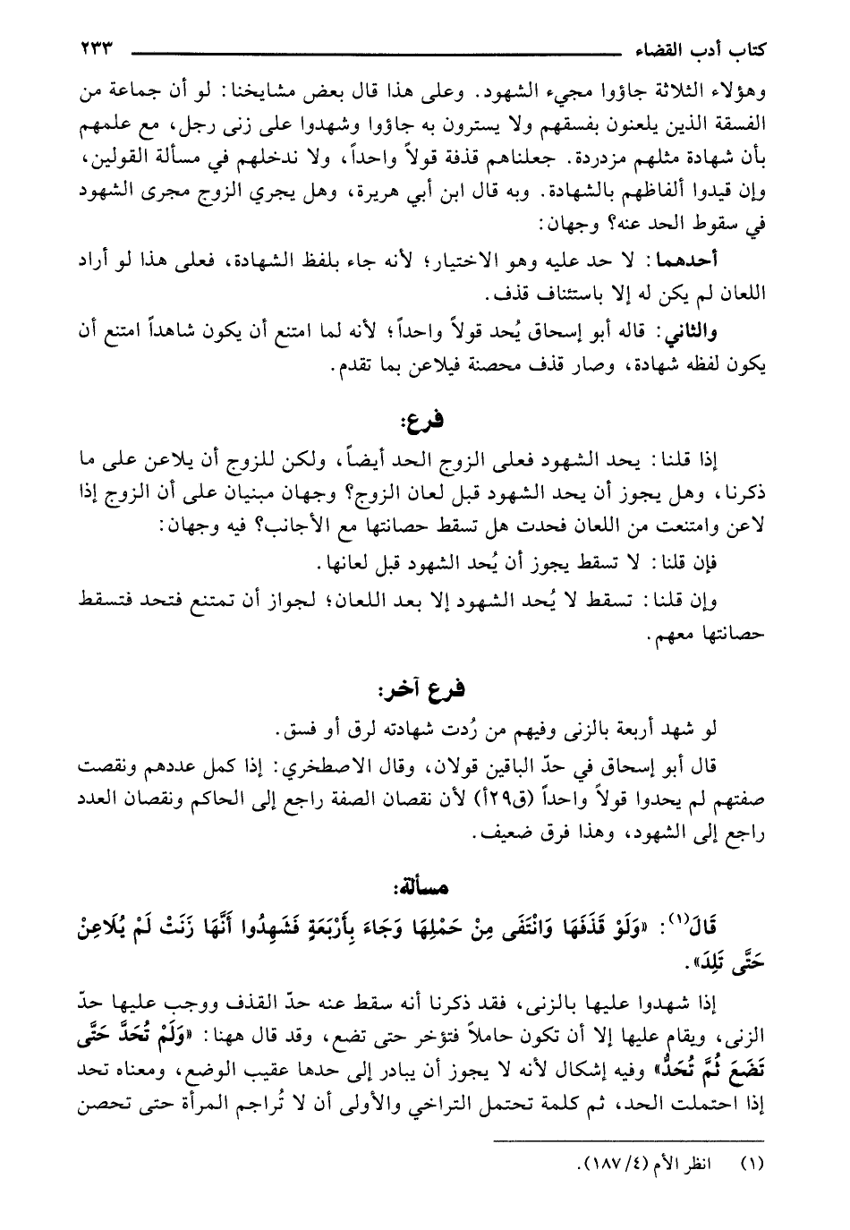 إذا شهدوا عليها الزاني، فقد ذكرنا أنه سقط عنه حدّ القذف ووجب عليها حدّ الزاني، ويقاوم عليها إلا تكون حاملاً فتؤخر حتى تضع، وقد قال ههنا: " ولَمْ تُحَدَّ حَتَّى تَضَعَ ثُمَّ تحُد" وفيه إشكال لأنه لا يجوز أن يبادر إلي حدها عقب الوضع، ومعناه تحد إذا احتملت الحد، ثم كلمة تحتمل التراخي والولي أن لا تُراحم المرأة حتى تحصن