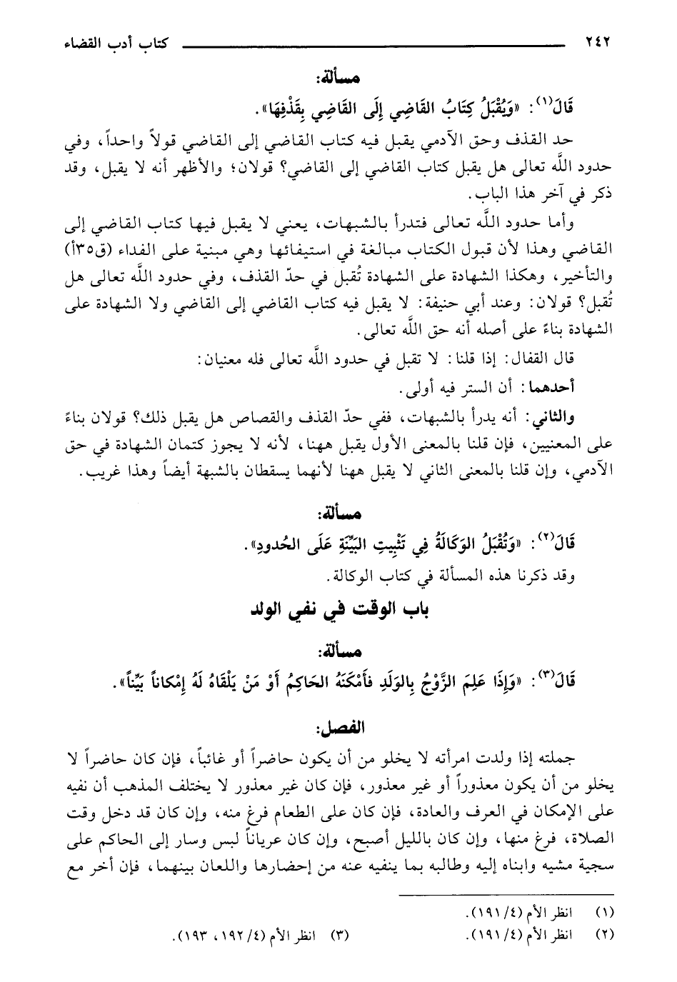 وأما حدود الله تعالى فتدرأ بالشبهات، يعني لا يقبل فيها كتاب القاضي إلى القاضي وهذا لأن قبول الكتاب مبالغة في استيفائها وهي مبنية على الفداء (ق 35 أ) والتأخير، وهكذا الشهادة على الشهادة تقبل في حد القذف، وفي حدود الله تعالى هل تقبل؟ قولان: وعند أبي حنيفة: لا يقبل فيه كتاب القاضي إلى القاضي ولا الشهادة على الشهادة بناءً على أصله أنه حق الله تعالى.