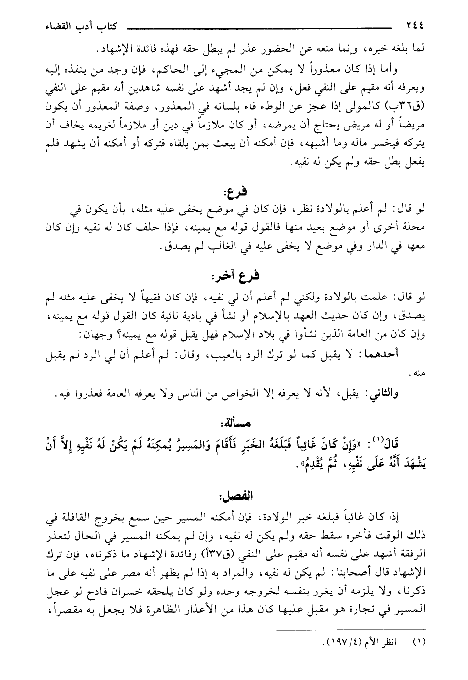 إذا كان غائباً فبلغه خبر الولادة، فإن أمكنه المسير حين سمع بخروج القافلة في ذلك الوقت فأخره سقط حقه ولم يكن له نفيه، وإن لم يمكنه المسير في الحال لتعذر الرفقة أشهد على نفسه أنه مقيم على النفي (ق 37 أ) وفائدة الإشهاد ما ذكرناه، فإن ترك الإشهاد قال أصحابنا: لم يكن له نفيه، والمراد به إذا لم يظهر أ، هـ مصر على نفيه على ما ذكرنا، ولا يلزمه أن يغرر بنفسه لخروجه وحده ولو كان يلحقه خصران فادح لو عجل المسير في تجارة هو مقبل عليها كان هذا من الأعذار الظاهرة فلا يجعل به مقصراً،
