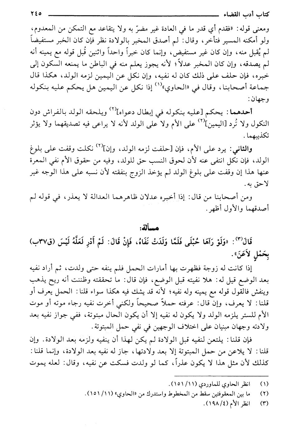 ومعنى قوله: "فقدم أي قدر ما في العادة غير مضر به ولا يتقاعد مع التمكن من المعدوم، ولو أمكنه المسير فتأخر، وقال: لم أصدق المخبر بالولادة نظر فإن كان الخبر مستفيضاً لم يقبل منه، وإن كان غير مستفيض، وإنما كان خبراً واحداً واثنين قبل قوله مع يمينه أنه لم يصدقه، وإن كان المخبر عدلاً؛ لأنه يجوز يعلم منه في الباطن ما يمنعه السكون إلى خبره، فإن حلف على ذلك كان له نفيه، وإن نكل عن اليمين لزمه الولد، هكذا قال جماعة أصحابنا، وقال في "الحاوي" إذا نكل عن اليمين هل يحكم عليه بنكو له وجهان: