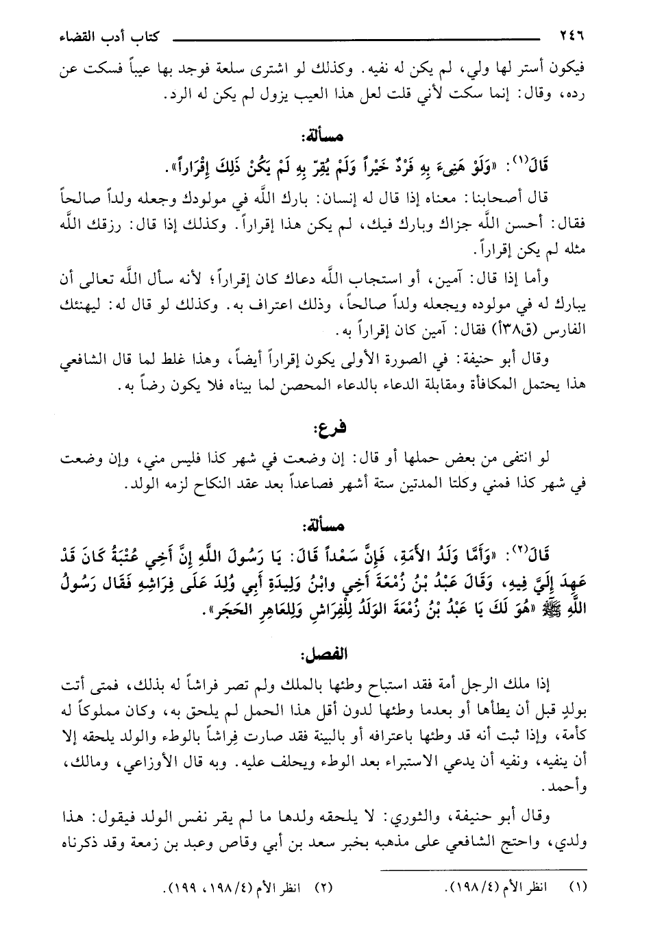 قال: "وأما ولد الأمة، فإن سعداً قال: يا رسول الله إن أخي عتبة كان قد عهد إلى فيه، وقال عبد بن زمعة أخي وابن الوليدة أبي ولد على فراشه فقال رسول الله صلى الله عليه وسلم "هو لك يا عبد بن زمعة الولد للفراش وللعاهر الحجر".