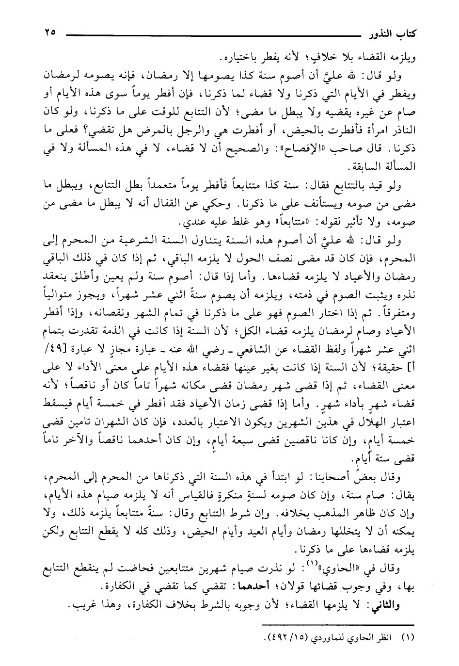 ولو قال: لله عليَّ أن أصوم سنة كذا يصومها إلا رمضان، فإنه يصومه لرمضان ويفطر في الأيام التي ذكرنا ولا قضاء لما ذكرنا، فإن أفطر يوماً سوى هذه الأيام أو صام عن غيره يقضيه ولايبطل ما مضى؛ لأن التتابع للوقت على ما ذكرنا، ولو كان الناذر امرأة فأطرت بالحيض، أو أفطرت هي والرجل بالمرض هل تقضي؟ فعلى ما ذكرنا. قال صاحب "الإفصاح": والصحيح أن لا قضاء، لا في هذه المسألة ولا في المسألة السابقة.