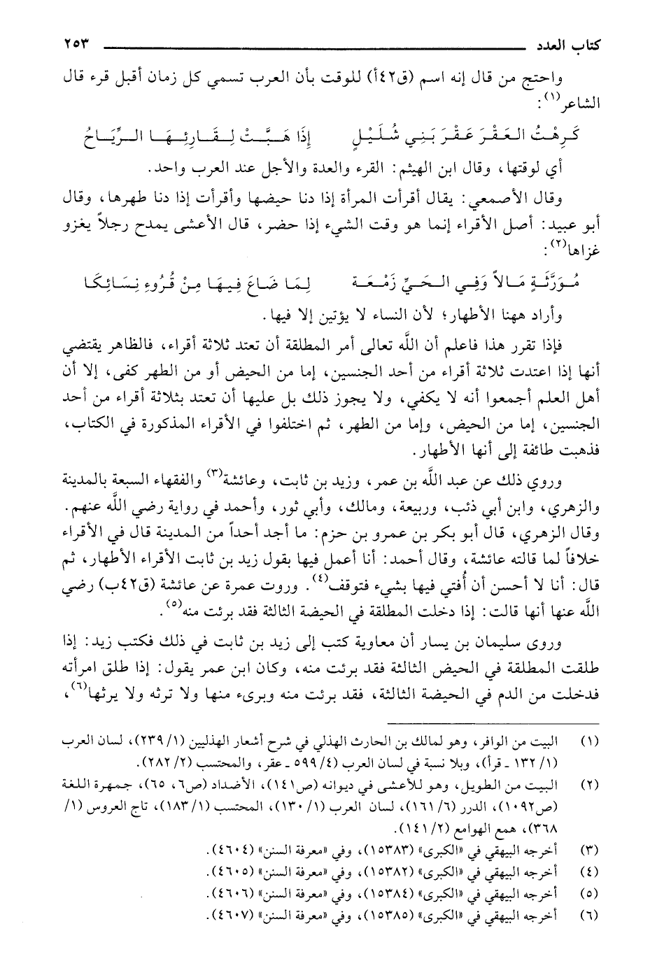 وروي ذلك عن عبد الله بن عمر، وزيد بن ثابت، وعائشة والفقهاء السبعة بالمدينة والزهري، وابن أبي ذئب، وربيعة، ومالك، وأبي ثور، وأحمد في رواية رضي الله عنهم. وقال الزهري، قال أبو بكر بن عمرو بن حزم: ما أجد أحداً من المدينة قال في الأقراء خلافاً لما قالته عائشة، وقال أحمد: أنا أعمل فيها بقول زيد بن ثابت الأقراء الأطهار، ثم قال: أنا لا أحسن أفتي بشيء فتوقف. وروت عمرة عن عائشة (ق 42 ب) رضي الله عنها أنها قالت: إذا دخلت المطلقة في الحيضة الثالثة فقد برئت منه.