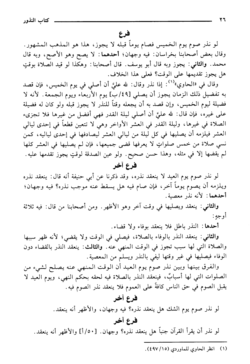والثاني: ينعقد بالوفاء بالصلاة، فيصلي في الوقت ولا يقضي؛ لأنه ظهر سببها والصلاة التي لها سبب تجوز في الوقت المنهي عنه. والثالث: ينعقد النذر بالقضاء دون الوفاء فيصليها في غير وقتها ليفي بالنذر ويسلم من المعصية.