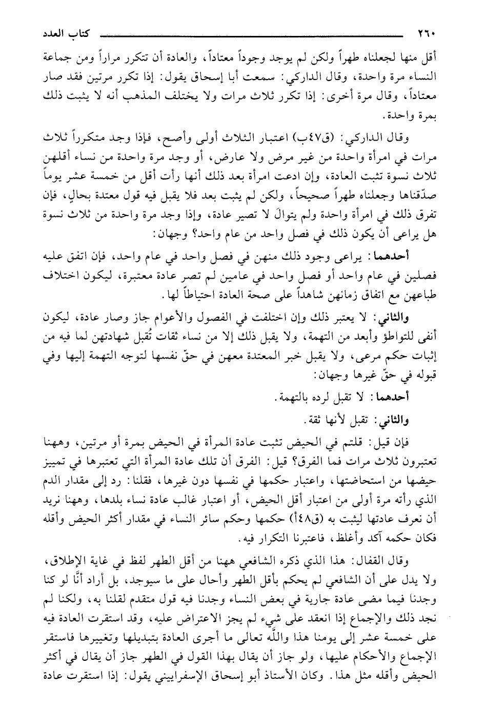 وقال الداركي: (ق 47 ب) اعتبار الثلاث أولى وأصح، فإذا وجد متكرراً ثلاث مرات في امرأة واحدة من غير مرض ولا عارض، أو وجد مرة واحدة من نساء أقلهن ثلاث نسوة تثبت العادة، وإن ادعت امرأة بعد ذلك أنها رأت أقل من خمسة عشر يوماً صدقناها وجعلناه طهراً صحيحاً، ولكن لم يثبت بعد فلا يقبل فيه قول معتدة بحال، فإن تفرق ذلك في امرأة واحدة ولم يتوال لا تصير عادة، وإذا وجدة مرة واحدة من ثلاث نسوة هل يراعى أن يكون ذلك في فصل واحد من عام واحد؟ وجهان: