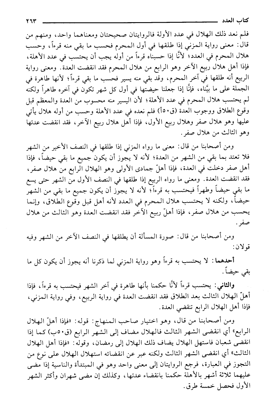 ومن أصحابنا من قال: معنى ما رواه المزني إذا طلقها في النصف الأخير من الشهر فلا تعتد بما بقي من الشهر من العدة؛ لأنه لا يجوز أن يكون جميع ما بقي حيضًا, فإذا أهل صفر دخلت في العدة, فإذا أهلّ جمادي الأولى وهو الهلال الرابع من هلال صفر, فقد انقضت العدة. ومعنى ما رواه الربيع إذا طلقها في النصف الأول من الشهر حتى يسع ما بقي حيضًا وطهرًا فيحتسب به قرءًا؛ لأنه لا يجوز أن يكون جميع ما بقي من الشهر حيضًا, ولكنه لا يحتسب هلال المحرم في العدد لأنه أهل قبل وقوع الطلاق, وإنما يحسب من هلال صفر, فإذا أهلّ ربيع الآخر فقد انقضت العدة وهو الثالث من هلال صفر.