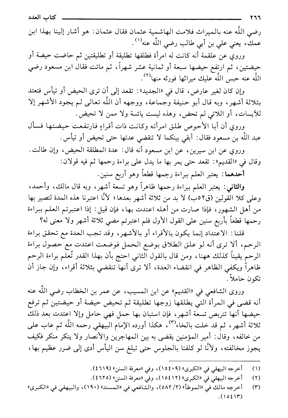 وروى الشافعي في "القديم" عن ابن المسيب, عن عمر بن الخطاب رضي الله عنه أنه قضى في المرأة التي يطلقها زوجها تطليقة ثم تحيض حيضة أو حيضتين ثم ترفع حيضها أنها تتربص تسعة أشهر, فإن استبان بها حمل فهي حامل وإلا اعتدت بعد ذلك ثلاثة أشهر, ثم قد خلت بالخاء، هكذا أورده الإمام البيهقي رحمه الله ثم عاب على من خالفه, وقال: أمير المؤمنين يقضي به بين المهاجرين والأنصار ولا ينكر منكر فكيف يجوز مخالفته, ولأنَّا لو كلفنا بالجلوس حتى تبلغ سن اليأس أدى إلى ضرر عظيم بها,