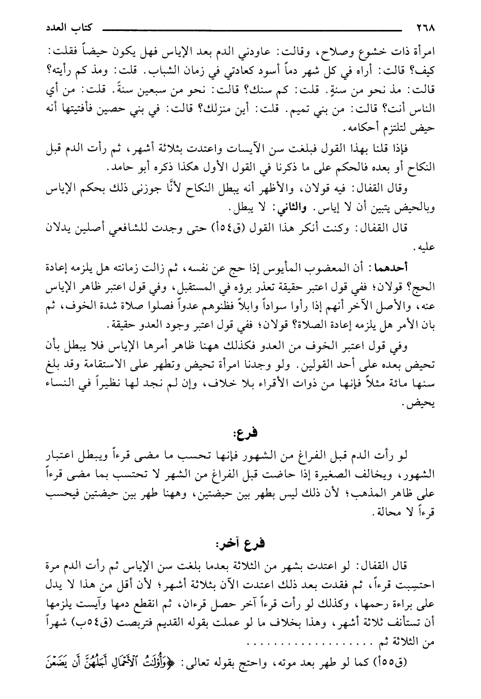 وفي قول اعتبر الخوف من العدو فكذلك ههنا ظاهر أمرها الإياس فلا يبطل بأن تحيض بعده على أحد القولين. ولو وجدنا امرأة تحيض وتطهر على الاستقامة وقد بلغ سنها مائة مثلًا فإنها من ذوات الأقراء بلا خلاف, وإن لم نجد لها نظيرًا في النساء يحيض.
