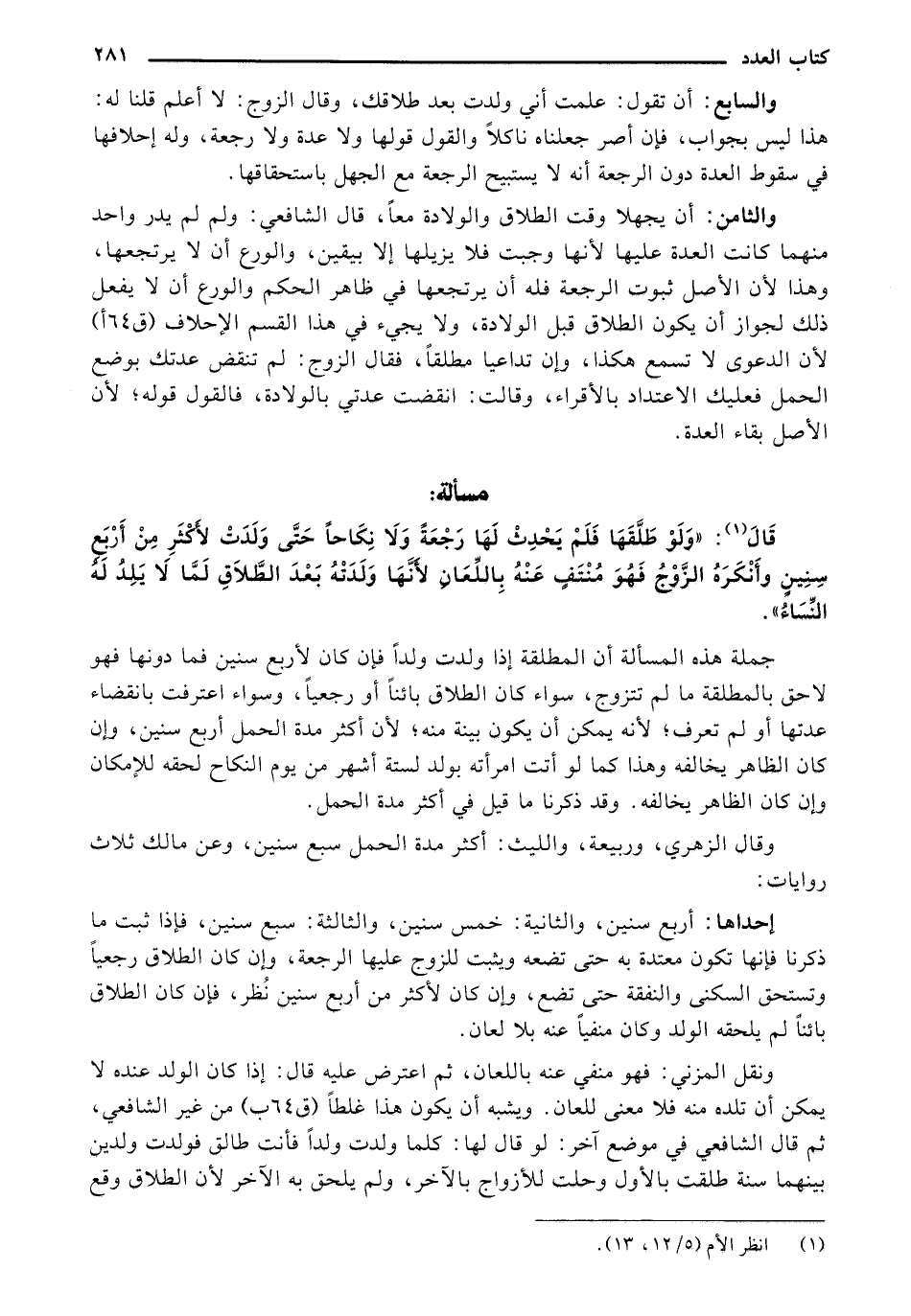 والسابع: أن تقول: علمت أني ولدك بعد طلاقك، وقال الزوج: لا أعلم قلنا له: هذا ليس بجواب، فإن أصر جعلناه ناكلاً والقول قولها ولا عدة ولا رجعة، وله إحلافها في سقوط العدة دون الرجعة انه لا يستبيح الرجعة مع الجهل باستحقاقها.