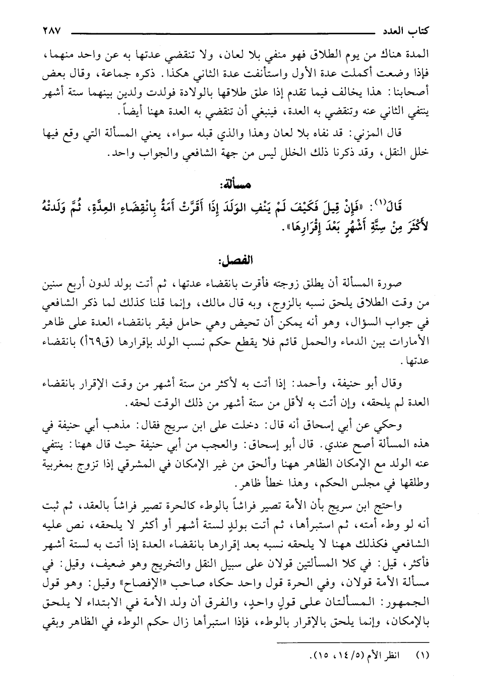 صورة المسألة أن يطلق زوجته فأقرب بانقضاء عدتها، ثم أتت بولد لدون أربع سنين من وقت الطلاق يلحق نسبه بالزوج، وبه قال مالك، وإنما قلنا كذلك لما ذكر الشافعي في جواب السؤال، وهو أنه يمكن أن تحيض وهي حامل فيقر بانقضاء العدة على ظاهر الأمارات بين الدماء والحمل قائم فلا يقطع حكم نسب الولد بإقرارها [ق 65 أ] بانقضاء عدتها.