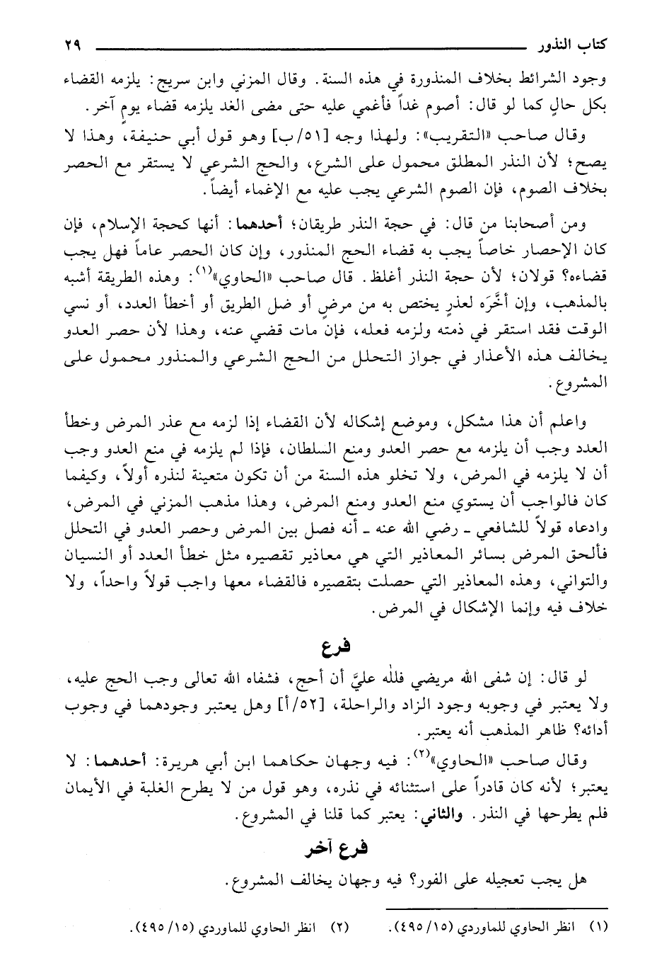 ومن أصحابنا من قال: في حجة النذر طريقان؛ أحدهما: أنها كحجة الإسلام، فإن كان الإحصار خاصاً يجب به قضاء الحج المنذور، وإن كان الحصر عاماً فهل يجب قضاءه؟ قولان؛ لأن حجة النذر أغلظ. قال صاحب "الحاوي": وهذه الطريقة أشبه بالمذهب، وإن أخَّرَه لعذرٍ يختص به من مرضٍ أو ضل الطريق أو أخطأ العدد، أو نسي الوقت فقد استقر في ذمته ولزمه فعله، فإن مات قضي عنه، وهذا لأن حصر العدو يخالف هذه الأعذار في جواز التحلل من الحج الشرعي والمنذور محمول على المشروع.