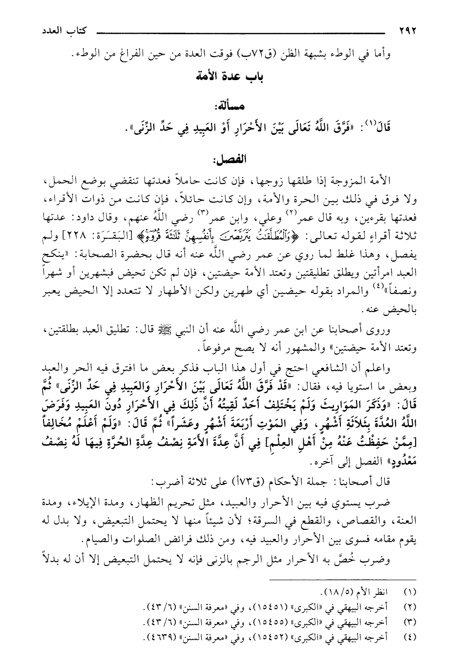واعلم أن الشافعي احتج في أول هذا الباب فذكر بعض ما افترق فيه الحر والعبد وبعض ما استويا فيه، فقال: "قَدْ فَرَّقَ اللَّهُ تَعَالَى بَيْنَ الأَحْرَارِ وَالعَبِيدِ فِي حَدَّ الزَّنَى" ثُمَّ قَالَ: "وَذَكَرَ المَوَارِيثَ وَلَمْ يَخْتَلِفْ أَحَدٌ لَقِيتُهُ أَنَّ ذَلِكَ فِي الأَحْرَارِ دُونَ العَبِيدِ وَفَرَضَ اللَّهُ العُدَّةَ بِثَلاثَةِ أَشْهُرٍ، وَفِي المَوْتِ أَرْبَعَةَ أَشْهُرٍ وعَشَرًا" ثُمَّ قَالَ: "وَلَمْ أَعْلَمْ مُخَالِفًا [مِمَّنْ حَفِظْتُ عَنْهُ مِنْ أَهْلِ العِلْمِ] فِي أَنَّ عِدَّةَ الأَمَةِ نِصْفُ عِدَّةِ الحُرَّةِ فِيهَا لَهُ نِصْفُ مَعْدُودٍ" الفصل إلى آخره.