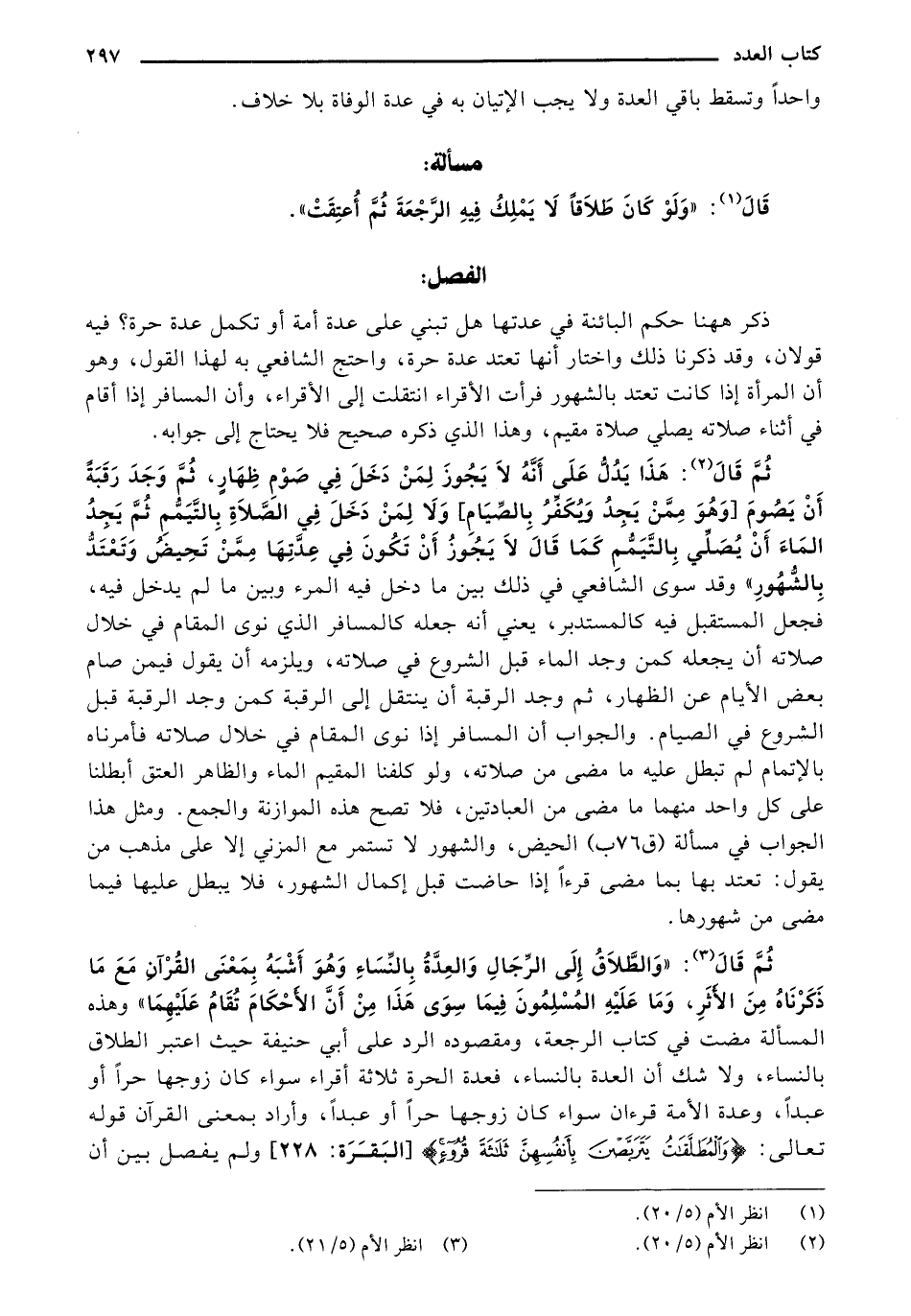 ثُمَّ قَالَ: "وَالطَّلاَقُ إِلَى الرَّجَالِ وَالعِدَّةُ بِالنَّسَاءِ وَهُوَ أَشْبَهُ بِمَعْنَى القُرْآنِ مَعَ مَا ذَكَرْنَاهُ مِنَ الأَثَرِ، زَمَا عَلَيْهِ المُسْلِمُونَ فِيمَا سِوَى هَذَا مِنْ أَنَّ الأَحْكَامَ تُقَامُ عَلَيْهِمَا" وهذه المسألة مضت في كتاب الرجعة، ومقصوده الرد على أبي حنيفة حيث اعتبر الطلاق بالنساء، ولا شك أن العدة بالنساء، فعدة الحرة ثلاثة أقراء سواء كان زوجها حرًا أو عبدًا، وعدة الأمة قرءان سواء كان زوجها حرًا أو عبدًا، وأراد بمعنى القرآن قوله تعالى: {والْمُطَلَّقَاتُ يَتَرَبَّصْنَ بِأَنفُسِهِنَّ ثَلاثَةَ قُرُوءٍ} [البقرة: 228] ولم يفصل بين أن