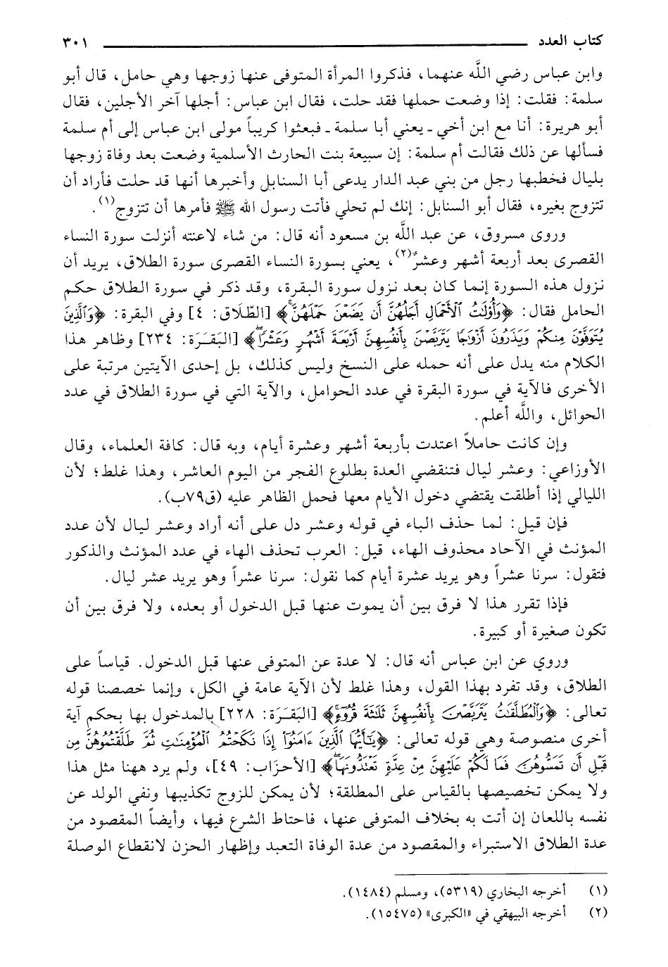وابن عباس رضي الله عنهما، فذكروا المرأة المتوفي عنها زوجها وهي حامل، قال أبو سلمة: فقلت: إذا وضعت حملها فقد حلت، فقال ابن عباس: أجلها آخر الأجلين، فقال أبو هريرة: أنا مع ابن أخي - يعني أبا سلمة- فبعثوا كريبًا مولى ابن عباس إلى أم سلمة فسألها عن ذلك فقالت أم سلمة: إن سبيعة بنت الحارث الأسلمية وضعت بعد وفاة زوجها بليال فخطبها رجل من بني عبد الدار يدعى أبا السنابل وأخبرها أنها قد حلت فأراد أن تتزوج بغيره، فقال أبو السنابل: إنك لم تحلي فأتت رسول الله صلى الله عليه وسلم فأمرها أن تتزوج.