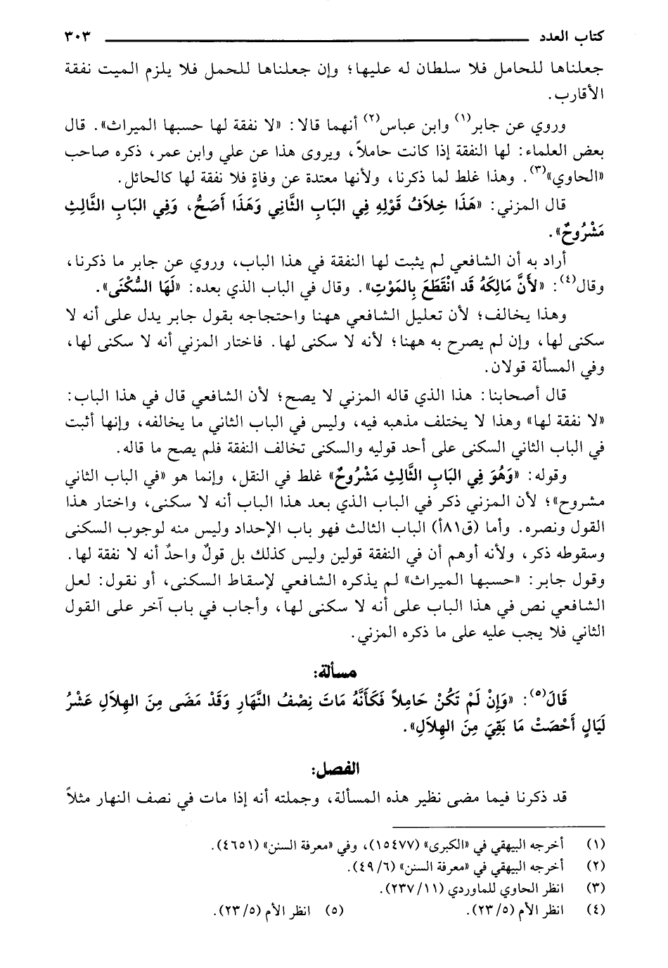 وقوله: "وَهُوَ فِي البَابِ الثَّالِثِ مَشْرُوحٌ" غلط في النقل، وإنما هو "في الباب الثاني مشروح"؛ لأن المزني ذكر في الباب الذي بعد هذا الباب أنه لا سكنى، واختار هذا القول ونصره. وأما [ق 81 أ] الباب الثالث فهو باب الإحداد وليس منه لوجوب السكنى وسقوطه ذكر، ولأنه أوهم أن في النفقة قولين وليس كذلك بل قولٌ واحدٌ أنه لا نفقة لها. وقول جابر: "حسبها الميراث" لم يذكره الشافعي لإسقاط السكنى، أو نقول: لعل الشافعي نص في هذا الباب على أنه لا سكنى لها، وأجاب في باب آخر على القول الثاني فلا يجب عليه على ما ذكره المزني.