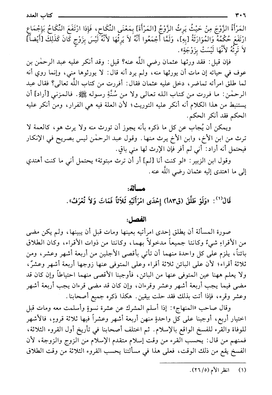 فإن قيل: فقد ورثها عثمان رضي الله عنه؟ قيل: وقد أنكر عليه عبد الرحمن بن عوف في حياته إن مات أن يورثها منه، ولم يرد أنه قال: لا يورثوها مني، وإنما روي أنه لما طلق امرأته تماضر، دخل عليه عثمان فقال: أفررت من كتاب الله تعالى؟ فقال عبد الرحمن: ما فررت من كتاب الله تعالى ولا من سُنَّةِ رسوله صلى الله عليه وسلم. فالمزني [أراد] أن يستنبط من هذا الكلام أنه أنكر عليه التوريث؛ لأن العلة فيه هي الفرار، ومن أنكر عليه الحكم فقد أنكر الحكم.