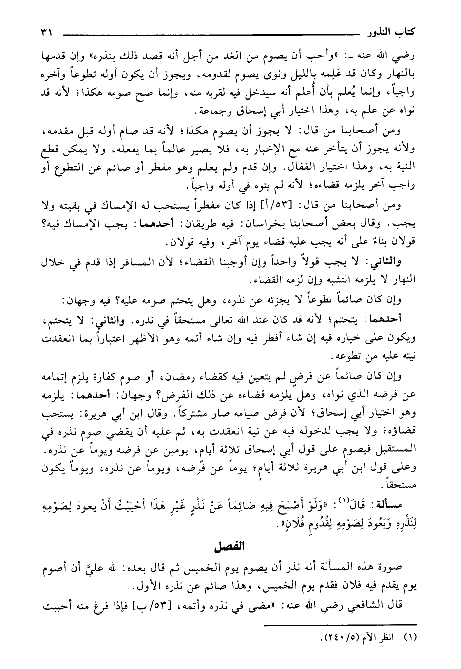 رضي الله عنه-: "وأحب أن يصوم من الغد من أجل أنه قصد ذلك بنذره" وإن قدمها بالنهار وكان قد علمه بالليل ونوى يصوم لقدومه، ويجوز أن بكون أوله تطوعًا وآخره واجبًا، وإنما يعلم بأن أعلم أنه سيدخل فيه لقربه منه، وغنما صح صومه هكذا؛ لأنه قد نواه عن علم به، وهذا اختيار أبي إسحاق وجماعة.
