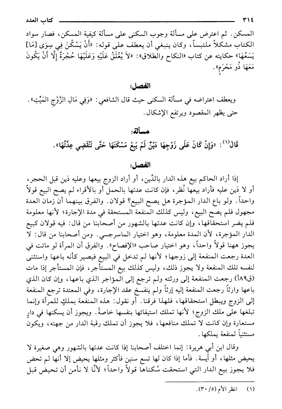 المسكن. ثم اعترض على مسألة وجوب السكنى على مسألة كيفية المكسن، فصار سواد الكتاب مشكلًا ملتبسًا، وكان ينبغي أن يعطف على قوله: "أَنْ يَسْكُنَ فِي سِوَى [مَا] يَسَعُهَا" حكايته عن كتاب "النكاح والطلاق": "لَا يُغْلَقُ عَلَيْهِ وَعَلَيْهَا حُجْرَةٌ إِلَّا أَنْ يَكُونَ مَعَهَا ذُو مَحْرَمٍ".