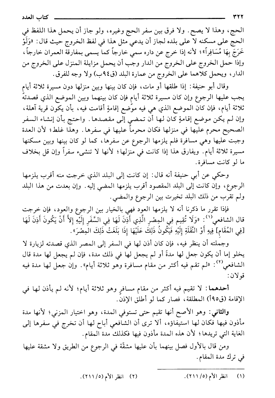 الحج، وهذا لا يصح. ولا فرق بين سفر الحج وغيره، ولو جاز أن يحمل هذا اللفظ في الحج على مسكنه لا على بلده لجاز أن يدعي مثل هذا في لفظ الخروج حيث قال: "ولو خرج بها مسافرًا" لأنه إذا خرج عن داره سمي خارجًا كما يسمى بمفارقة العمران خارجًا، وإذا حمل الخروج على الخروج من الدار وجب أن يحمل مزايلةً المنزل على الخروج من الدار، ويحمل كلاهما على الخروج من عمارةً البلد (ق 94 ب) ولا وجه للفرق.