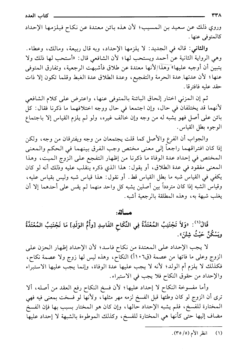 والجواب أن الفرع والأصل كما قلت يجتمعان من وجه ويفترقان من وجه، ولكن إذا كان افتراقهما راجعًا إلى معنى مختص وجب الفرق بينهما في الحكم والمعنى المختص في إحداد عدةً الوفاةً ما ذكرنا من إظهار المفجع على الزوج الميت، وهذا المعنى مفقود في عدة الطلاق، أو يقول: هذا الذي ذكره ينقلب عليه وذلك أنه لو كان يكفي في القياس شبه ما بطل القياس قط. آو نقول: هذا قياس شبه وليس بقياس عليه، وقياس الشبه إذا كان مترددًا بين أصلين يشبه كل واحد منهما لم يقس على أحدهما إلا أن يغلب شبهة به، وهذه المطلقةً بالرجعيةً أشبه.