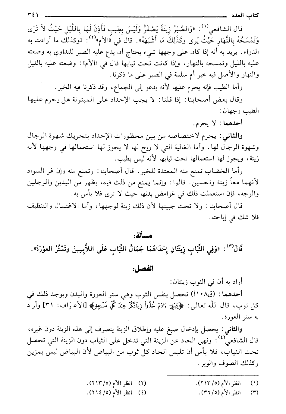 والثاني: يحصل بإدخال صبغ عليه وإطلاق الزينة ينصرف إلي هذه الزينة دون غيره، قال الشافعي: ونهي الحاد عن الزينة التي تدخل على الثياب دون الزينة التي تحصل تحت الثياب، فلا بأس أن تلبس الحاد كل ثوب من البياض لأن البياض ليس بمزين وكذلك الصوف والوبر.