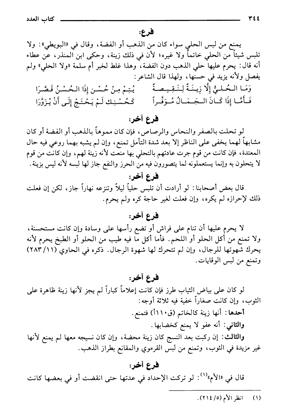 يمنع من لبس الحلي سواء كان من الذهب أو الفضة، وقال في "البويطي": ولا تلبس شيئاً من الحلي خاتماً ولا غيره؛ لأن في ذلك زينة، وحكي ابن المنذر، عن عطاء أنه قال: يحرم عليها حلي الذهب دون الفضة، وهذا غلط لخبر أم سلمه" ولا الحلي" ولم يفصل ولأنه يزيد في حسنها، ولهذا الشاعر: