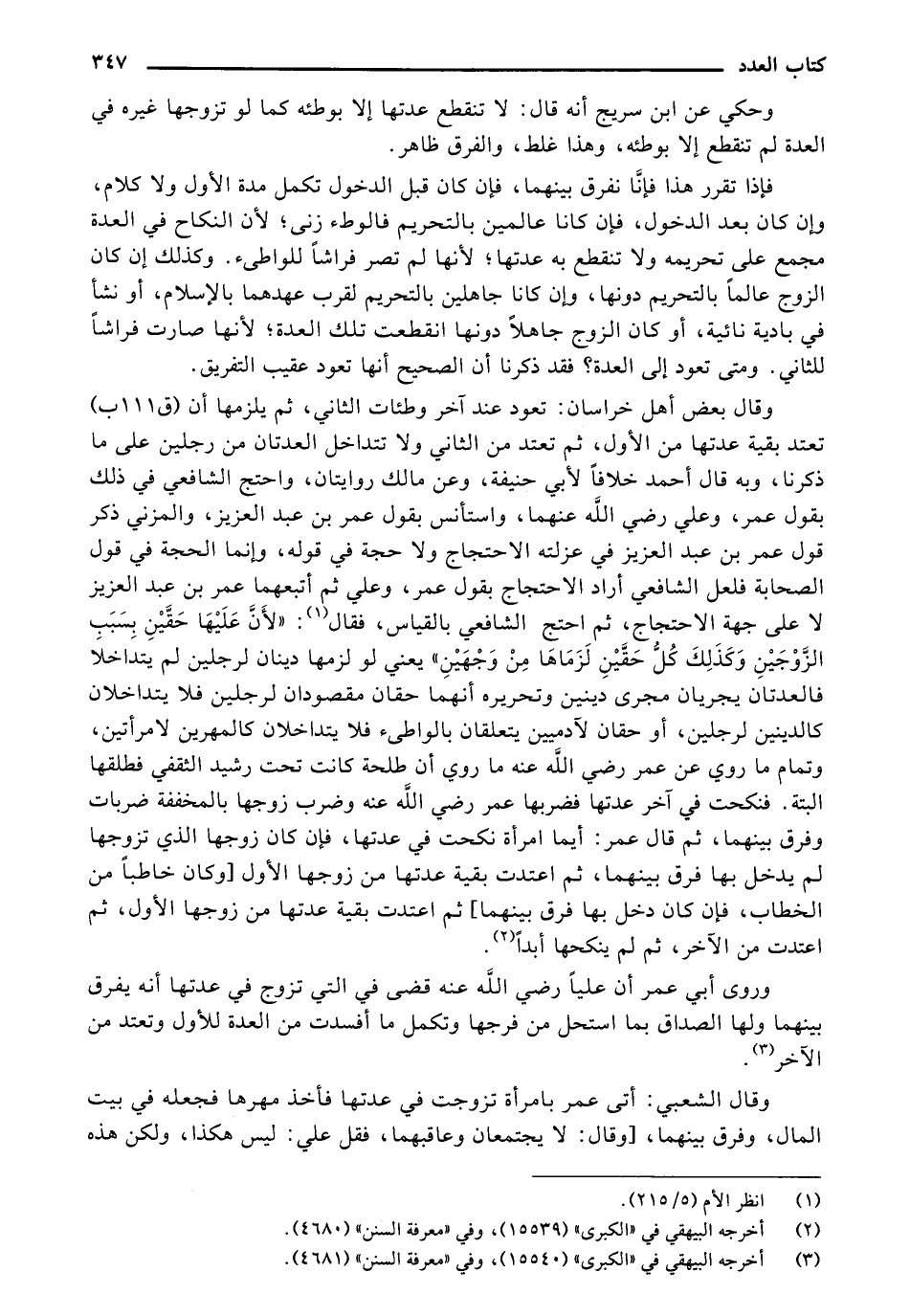 وقال بعض أهل خراسان: تعود عند آخر وطئ الثاني، ثم يلزمها أن (ق 111 ب) تعتد بقية عدتها من الأول، ثم تعتد من الثاني، ولا تتداخل العدتان من رجلين علي ما ذكرنا، وبه قال أحمد خلافاً لأبي حنيفة، وعن مالك روايتان، واحتج الشافعي في ذلك بقول عمر، وعلي رضي الله عنهما، واستأنس بقول عمر بن عبد العزيز، والمزني ذكر قول عمر بن عبد العزيز في عزلته الاحتجاج ولا حجة في قوله، وإنما الحجة في قول الصحابة فلعل الشافعي أراد الاحتجاج بقول عمر، وعلي ثم أبعهما عمرين عبد العزيز لا علي جهة الاحتجاج، ثم احتج الشافعي بالقياس، فقال: فقال " لأن عليها حقين بسبب الزوجين وكذلك كل حقين لزممها من وجهين" يعني لو لزممها دينان لرجلين لم يتداخلا فالغدتان يجريان مجري دينين وتحريره أنهما حقان مقصودان لرجلين فلا يتداخلان كالدينين لرجلين، أو حقان لآدميين يتعلقان بالواطئ فلا يتداخلان كالمهرين لا مرآتين، وتمام ما روي عن عمر رضي الله عنه ما روي أن طلحة كانت تحت رشيد الثقفي فطلقها ألبته. فنكحت في آخر عدتها فضربها عمر رضي الله عنه وضرب زوجها بالمخففة ضربات وفرق بينهما، ثم قال عمر: أيما امرأة نكحت في عدتها، فإن كان زوجها الذي تزوجها لم يدخل بها فرق بينهما، ثم اعتدت بقية عدتها من زوجها الأول [وكان خاطباً من الخطاب، فإن كان دخل بها فرق بينهما] ثم اعتدت بقية عدتها من زوجها الأول، ثم اعتدت من الآخر، ثم لم ينكحها أبداً وروي أبي عمر أن عليا رضي الله عنه قضي في التي تزوج في عدنها أنه يفرق بينهما ولها الصداق بما استحل من فرجها وتكمل ما أفسدت من العدة للأول وتعتد من الآخر.