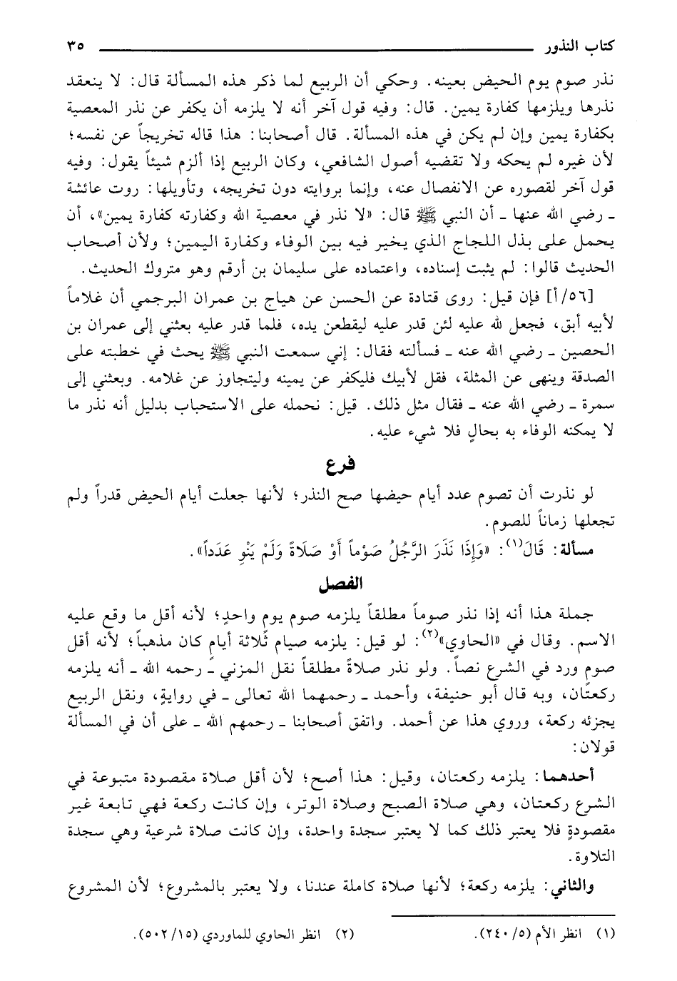 نذر صوم الحيض بعينه. وحكي أن الربيع لما ذكر هذه المسألة قال: لا ينعقد نذرها ويلزمها كفارة يمين. قال: وفيه قول آخر أنه لا يلزمهم أن يكفر عن نذر المعصية بكفارة يمين وإن لم يكن في هذه المسألة قال أصحابنا: هذا قاله تخريجًا عن نفسه؛ لأن غيره لم يحكه ولا نقضيه أصول الشافعي، وكان الربيع إذا ألزم شيئًا يقول: وفيه قولاً آخر لقصوره عن الانفصال عنه، وإنما بروايته دون تخريجه، وتأويلها: روت عائشة - رضي الله عنها - أن النبي صلى الله عليه وسلم قال "لا نذر في معصية الله وكفارته كفارة يمين"، أن يحمل على بذل اللجاج الذي يخير فيه بين الوفاء وكفارة اليمين؛ ولأن أصحاب الحديث قالوا: لم يثبت إسناده، واعتماده على سليمان بن أرقم وهو متروك الحديث.