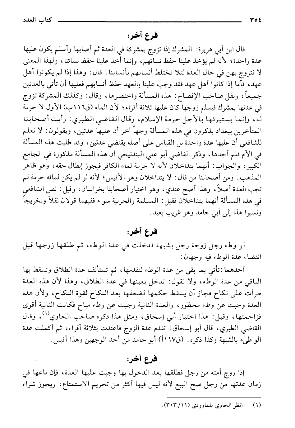 قال ابن أبي هريرة: المشترك إذا تزوج بمشركة في العدة ثم أصابها وأسلم يكون عليها عدة واحدة؛ لأنه لم يؤخذ علينا حفظ نسائهم، وإنما أخذ علينا حفظ نسائنا، ولهذا المعني لا نتزوج بهن في حال العدة لئلا تختلط أنسابهم بأنسابنا. قال: وهذا إذا لم يكونوا أهل عهد، فأما إذا كانوا أهل عهد فقد وجب علينا بالعهد حفظ أنسابهم فعليها أن تأتي بالعدتين جميعاً، ونقل صاحب الإفصاح: هذه المسألة واختصرها، وقال: وكذلك المشركة تزوج في عدتها بمشرك فيسلم زوجها كان عليها ثلاثة أقراء؛ لأن الماء [ق 116 ب] الأول لا حرمة له، وإنما يستبرئها بالأجل حرمة الإسلام، وقال القاضي الطبري: رأيت أصحابنا المتأخرين ببغداد يذكرون في هذه المسألة وجهاً آخر أن علينا عدتين، ويقولون: لا نعلم للشافعي أن عليها عدة واحدة بل القياس علي أصله يقتضي عدتين، وقد طلبت هذ المسألة في الأم فلم أجدها، وذكر القاضي أبو علي البنديجي أن هذه المسألة مذكورة في الجامع الكبير والجواب: أنهما يتداخلان لأنه لا حرمة لماء الكافر فيجوز إبطال حقه، وهو ظاهر المذهب. ومن أصحابنا من قال: لا يتداخلان وهو الأقيس؛ لأنه لو لم يكن لمائه حرمة لم تجب العدة أصلاً، وهذا أصح عندي، وهو اختيار أصحابنا بخراسان، وقيل: نص الشافعي في هذه المسألة أنهما يتداخلان فقيل: المسلمة والحربية سواء ففيهما قولان نقلاً وتخريجاً ونسبوا إلي أبي حامد وهو غريب بعيد.