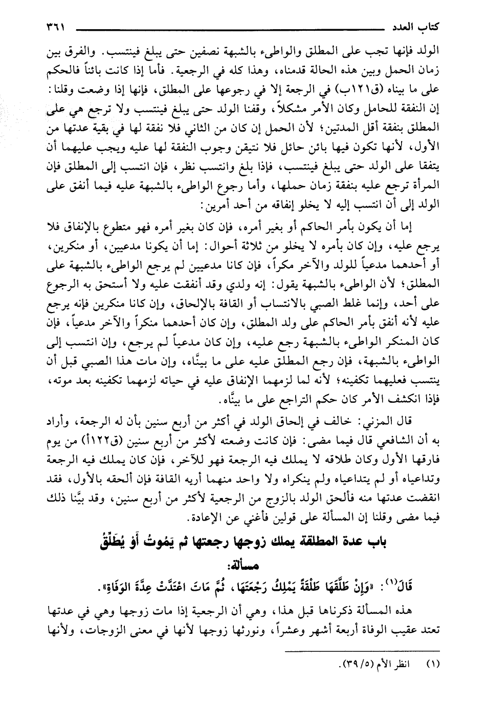 الولد فإنها تجب علي المطلق والواطئ بالشبهة نصفين حتى يبلغ فينتسب. والفرق بين زمان الحمل وبين هذه الحالة قدمناه، وهذا كله في الرجعية. فأما إذا كانت بأنا فالحكم علي ما بيناه [ق 121 ب] في الرجعة إلا في رجوعها علي المطلق، فإنها إذا وضعت وقلنا: إن النفقة للحامل وكان الأمر مشكلاً، وقفنا الولد حتى يبلغ فينتسب ولا ترجع هي علي المطلق بنفقة أقل المدتين؛ لأن الحمل إن كان من الثاني فلا نفقة لها في بقية عدتها من الأول، لأنها تكون فيها بائن حائل فلا نتقيهن وجوب النفقة لها عليه ويجب عليهما أن يتفقا علي الولد حتى يبلغ فينتسب، فإذا بلغ وانتسب نظر، فإن انتسب إلي المطلق فإن المرأة ترجع عليه بنفقة زمان حملها، وأما رجوع الواطئ بالشبهة عليه فيما أنفق علي الولد إلي أن انتسب إليه لا يخلو إنفاقه من أحد أمرين: