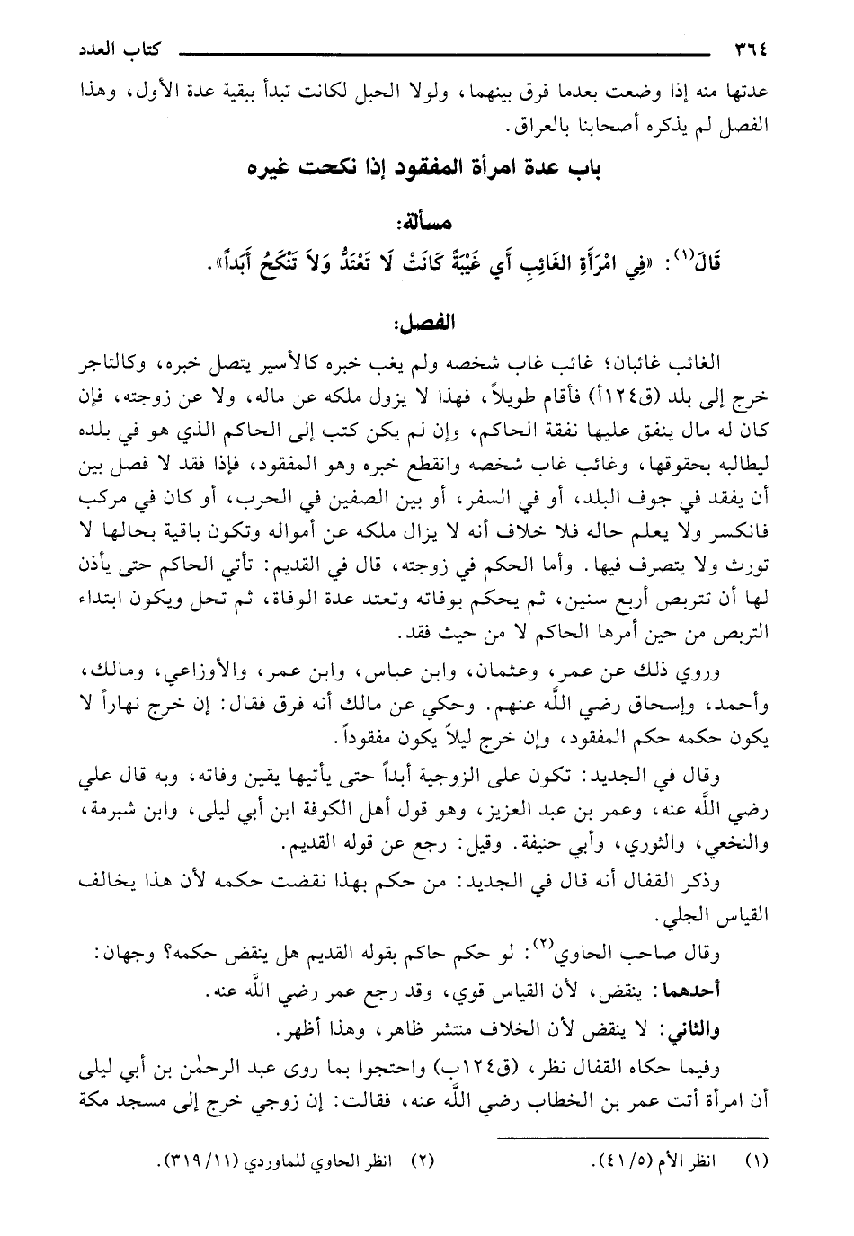 الغائب غائبان؛ غائب غاب شخصه ولم يغب خبره كالأسير يختص خبره، وكالتاجر خرج إلي بلد [ق 124 أ] فأقام طويلاً، فهذا لا يزول ملكه عن ماله، ولا عن زوجته، فإن كان له مال ينفق عليها نفقة الحاكم، وإن لم يكن كتب إلي الحاكم الذي هو في بلده ليطالبه بحقوقها، وغائب غاب شخصه وانقطع خبره وهو المفقود، فإذا فقد لا فصل بين أن يفقد في جوف البلد، أو في السفر، أو بين الصفين في الحرب، أو كان في مركب فانكسر ولا يعلم حاله فلا خلاف أنه لا يزال ملكه عن أمواله وتكون باقية بحالها لا تورث ولا يتصرف فيها. وأ/ االحكم في زوجته، قال القديم: تأتي الحاكم حتى يأذن لها أن تتربص أربع سنين، ثم يحكم بوفاته وتعتد عدة الوفاة، ثم تحل ويكون ابتداء التربص من حين أمرها الحاكم لا من حيث فقد.