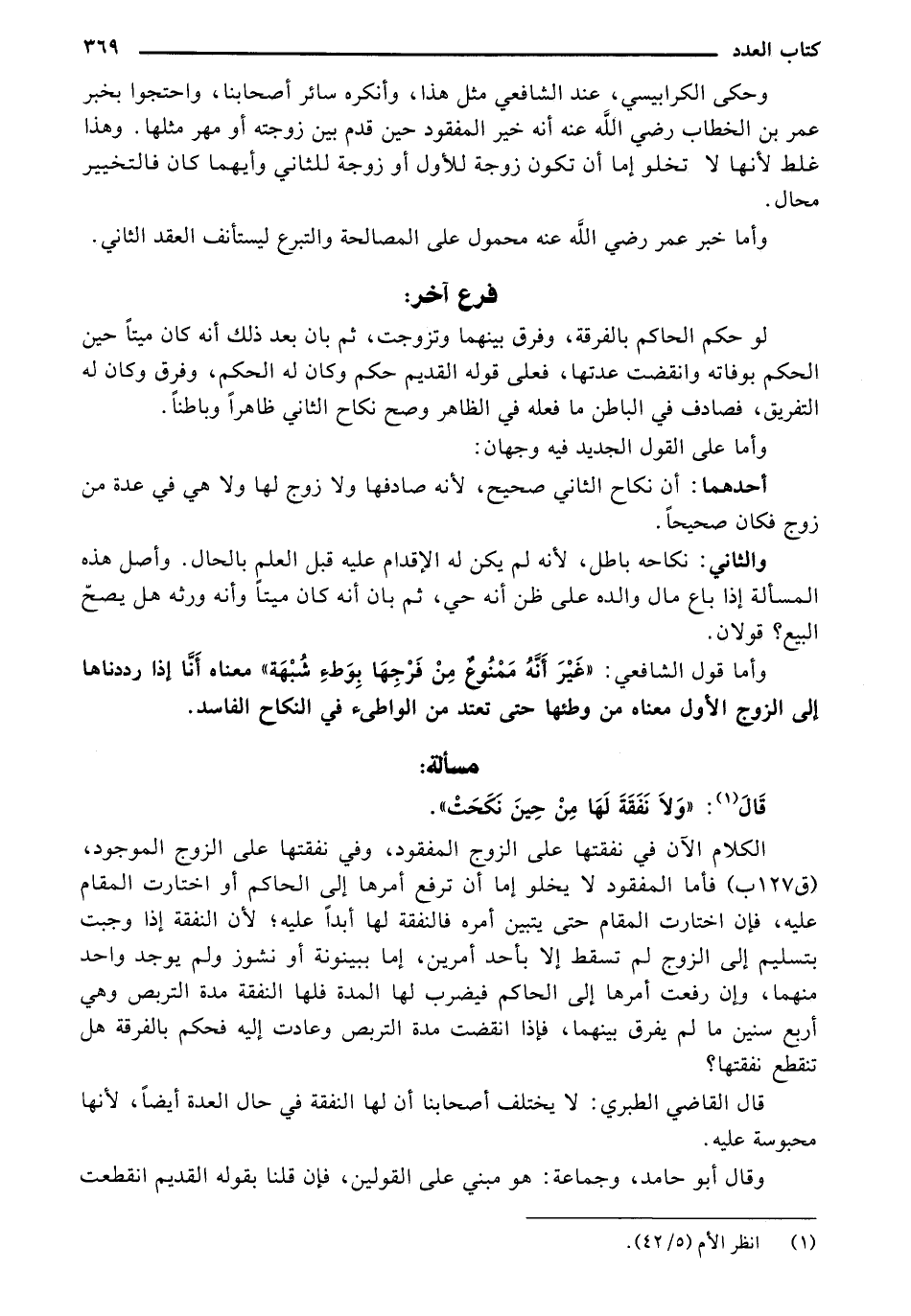 الكلام الآن في نفقتها علي الزوج بالمفقود، وفي نفقتها علي الزوج الموجود، [ق 127 ب] فأما المفقود لا يخلو إما أن ترفع أمرها إلي الحاكم أو اختارت المقام عليه، فإن اختارت المقام حتى يتبين أمره فالنفقة لها أيداً عليه؛ لأن النفقة إذا وجبت بتسليم إلي الزوج لم تسقط إلا بأحد أمرين، إما بينونة أو نشوز ولم يوجد واحد مننهما، وإن رفعت أمرها إلي الحاكم فيضرب لها المدة فلها النفقة مدة التربص وهي أربع ما لم يفرق بينهما، فإذا انقضت مدة التربص وعادت إليه فحم بالفرقة هل تنقطع نفقتها؟