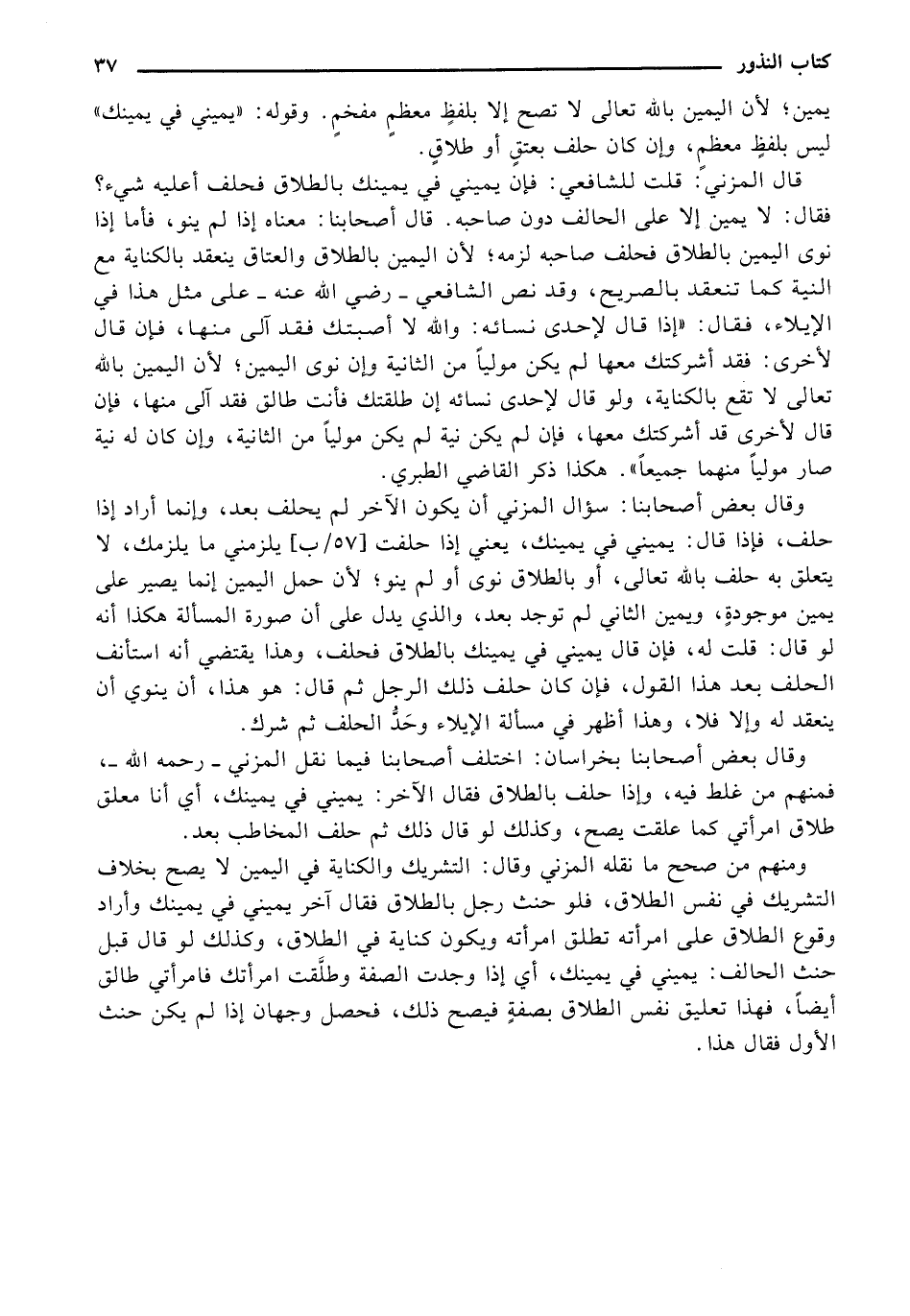 ومنهم من صحح ما نقله المزني وقال: التشريك والكناية في اليمين لا يصح بخلاف التشريك في نفس الطلاق، فلو حنث رجل بالطلاق فقال آخر يميني في يمينك وأراد وقوع الطلاق على امراته تطلق امرأته ويكون كناية في الطلاق، وكذلك لو قال قبل حنث الحالف: يميني في يمينك، أي إذا وجدت الصفة وطلقت امرأتك فامرأتي طالق أيضًا، فهذا تعليق نفس الطلاق بصفة فيصح ذلك، فحصل وجهان إذا لم يكن حنث الأول فقال هذا.