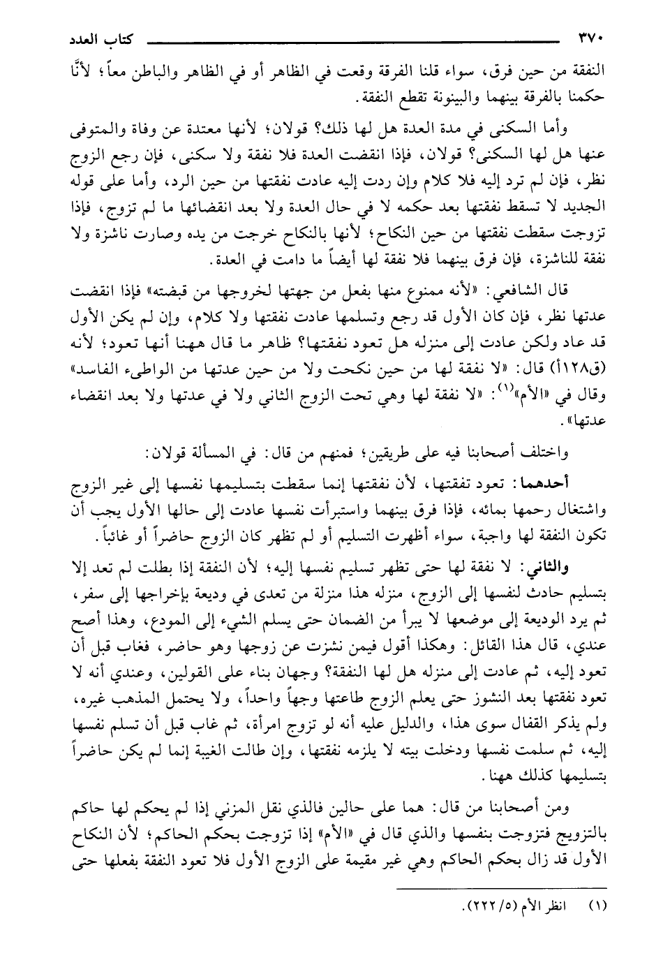 قال الشافعي: " لأنه ممنوع منها بفعل من جهتها لخروجها من قبضته" فإذا انقضت عدتها نظر، فإن الأول قد رجع وتسلمها عادت نفقتها ولا كلام، وإن لم يكن الأول قد عاد ولكن عادت إلي منزله هل تعود نفقتها؟ ظاهر ما قال ههنا أنها تعود؛ لأنه [ق 128 أ] قال: " النفقة لها من حين نكحت ولأمن حين عدتها من الواطئ الفاسد"