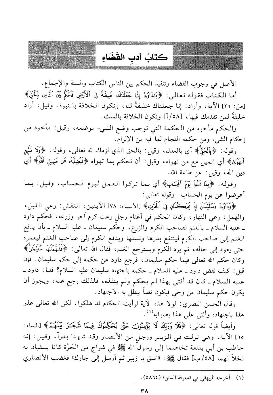{ودَاوُدَ وسُلَيْمَانَ إذْ يَحْكُمَانِ فِي الحَرْثِ} [الأنبياء: 78] الآيتين، النفش: رعي الليل، والهمل: رعي النهار، وكان الحكم في أغنام رجل رعت كرم آخر وزرعه، فحكم داود -عليه السلام- بالغنم لصاحب الكرم والزرع، وحكم سليمان -عليه السلام- بأن يدفع الغنم إلى صاحب الكرم لينتفع بدرها ونسلها ويدفع الكرم إلى صاحب الغنم ليعمره حتى يعود إلى حاله، ثم يرد الكرم ويسترجع الغنم، فقال الله تعالى: {فَفَهَّمْنَاهَا سُلَيْمَانَ} وكان حكم الله تعالى فيما حكم سليمان، فرجع داود عن حكمه إلى حكم سليمان. فإن قيل: كيف نقض داود -عليه السلام- حكمه باجتهاد سليمان عليه السلام؟ قلنا: داود -عليه السلام- كان قد أفتى بهذا لم يحكم ولم بنفذه، فلذلك رجع عنه، ويجوز أن يكون حكم سليمان من وحي فيكون نصًا يبطل به الاجتهاد.