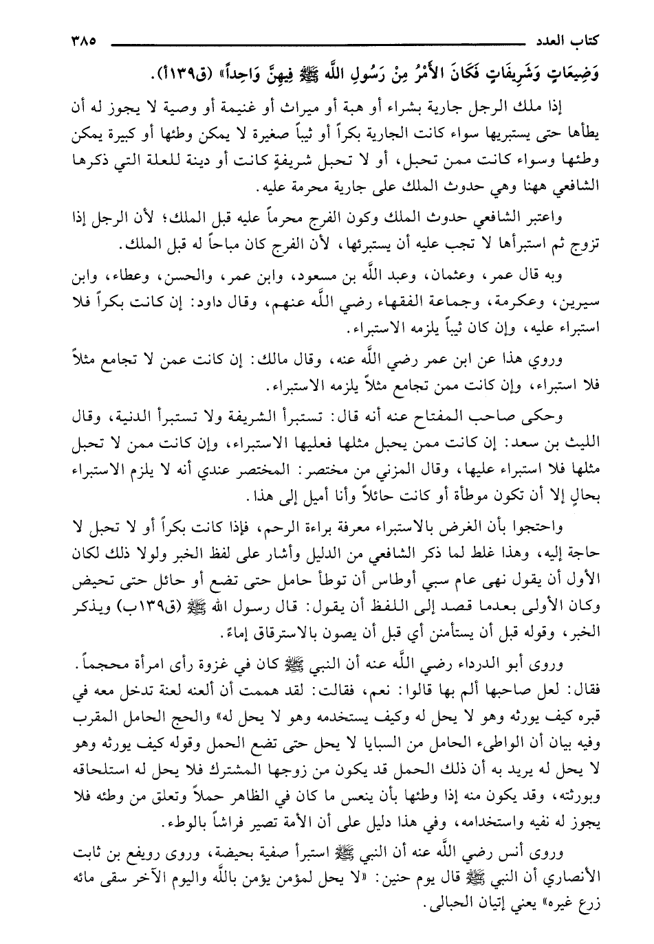 وروى أنس رضي الله عنه أن النبي صلى الله عليه وسلم استبرأ صفية بحيضة، وروى رويفع بن ثابت الأنصاري أن النبي صلى الله عليه وسلم قال يوم حنين: "لا يحل لمؤمن يؤمن بالله واليوم الآخر سقي مائه زرع غيره" يعني إتيان الحبالى.