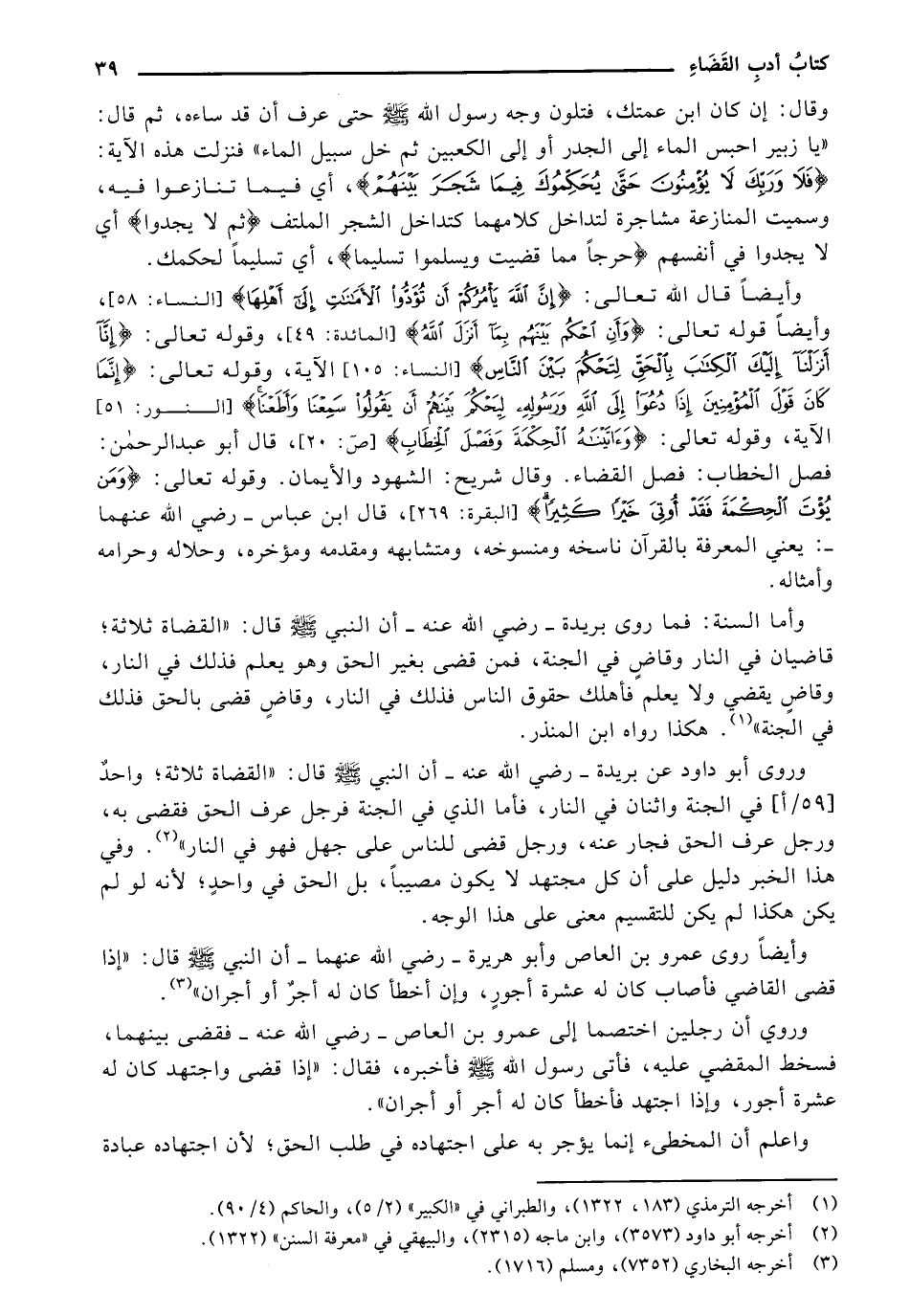 وأيضًا قال الله تعالى: {إنَّ اللَّهَ يَامُرُكُمْ أَن تُؤَدُّوا الأَمَانَاتِ إلَى أَهْلِهَا} [النساء: 58]، وأيضًا قوله تعالى: {وأَنِ احْكُم بَيْنَهُم بِمَا أَنزَلَ اللَّهُ} [المائدة: 49]، وقوله تعالى: {إنَّا أنزَلْنَا إلَيْكَ الكِتَابَ بِالحَقِّ لِتَحْكُمَ بَيْنَ النَّاسِ} [النساء: 105] الآية، وقوله تعالى: {إنَّمَا كَانَ قَوْلَ المُؤْمِنِينَ إذَا دُعُوا إلَى اللَّهِ ورَسُولِهِ لِيَحْكُمَ بَيْنَهُمْ أَن يَقُولُوا سَمِعْنَا وأَطَعْنَا} [النور: 51] الآية، وقوله تعالى: {وآتَيْنَاهُ الحِكْمَةَ وفَصْلَ الخِطَابِ} [ص:20]، قال أبو عبد الرحمن: فصل الخطاب: فصل القضاء. وقال شريح: الشهود والأيمان. وقوله تعالى: {مَن يَشَاءُ ومَن يُؤْتَ الحِكْمَةَ فَقَدْ أُوتِيَ خَيْرًا كَثِيرًا} [البقرة: 269]، قال ابن عباس -رضي الله عنهما-: يعني المعرفة بالقرآن ناسخة ومنسوخة، ومتشابهه ومقدمه ومؤخره، وحلاله وحرامه وأمثاله.