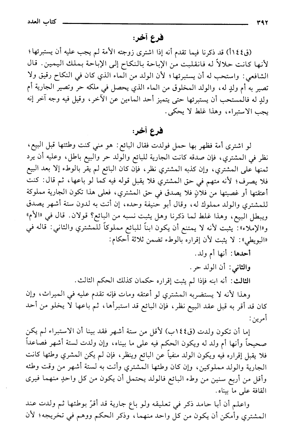 [ق 144 أ] قد ذكرنا فيما تقدم أنه إذا اشترى زوجته الأمة لم يجب عليه أن يستبرئها؛ لأنها كانت حلالًا له فانقلبت من الإباحة بالنكاح إلى الإباحة بملك اليمين. قال الشافعي: واستحب له أن يستبرئها؛ لأن الولد من الماء الذي كان في النكاح رقيق ولا تصير به أم ولدٍ له، والولد المخلوق من الماء الذي يحصل في ملكه حر وتصير الجارية أم ولدٍ له فالمستحب أن يستبرئها حتى يتميز أحد الماءين عن الآخر، وقيل فيه وجه آخر إنه يجب الاستبراء، وهذا غلط لا يحكى.