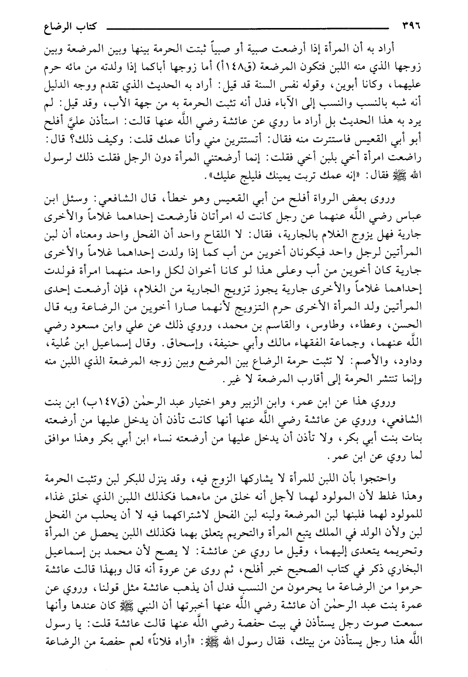 وروى بعض الرواة أفلح من أبي القعيس وهو خطأ، قال الشافعي: وسئل ابن عباس رضي الله عنهما عن رجل كانت له امرأتان فأرضعت إحداهما غلامًا والأخرى جارية فهل يزوج الغلام بالجارية، فقال: لا اللقاح واحد أن الفحل واحد ومعناه أن لبن المرأتين لرجل واحد فيكونان أخوين من أب كما إذا ولدت إحداهما غلامًا والأخرى جارية كان أخوين من أب وعلى هذا لو كانا أخوان لكل واحد منهما امرأة فولدت إحداهما غلامًا والأخرى جارية يجوز تزويج الجارية من الغلام، فإن أرضعت إحدى المرأتين ولد المرأة الأخرى حرم التزويج لأنهما صارا أخوين من الرضاعة وبه قال الحسن، وعطاء، وطاوس، والقاسم بن محمد، وروي ذلك عن علي وابن مسعود رضي الله عنهما، وجماعة الفقهاء مالك وأبي حنيفة، وإسحاق. وقال إسماعيل ابن عُلية، وداود، والأصم: لا تثبت حرمة الرضاع بين المرضع وبين زوجة المرضعة الذي اللبن منه وإنما تنتشر الحرمة إلى أقارب المرضعة لا غير.