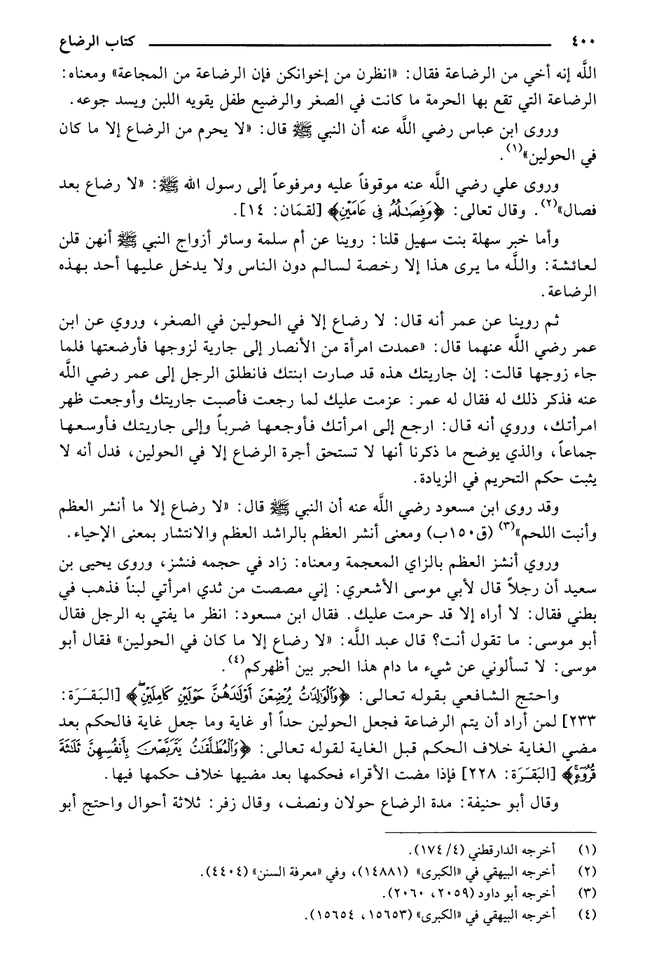 ثم روينا عن عمر أنه قال: لا رضاع إلا في الحولين في الصغر، وروي عن ابن عمر رضي الله عنهما قال: "عمدت امرأة من الأنصار إلى جارية لزوجها فأرضعته فلما جاء زوجها قالت: إن جاريتك هذه قد صارت ابنتك فانطلق الرجل إلى عمر رضي الله عنه فذكر ذلك له فقال له عمر: عزمت عليك لما رجعت فأصبت جاريتك وأوجعت ظهر امرأتك، وروي أنه قال: ارجع إلى امرأتك فأوجعها ضربًا وجاريتك فأوسعها جماعًا، والذي يوضح ما ذكرنا أنها لا تستحق أجرة الرضاع إلا في الحولين، فدل أنه لا يثبت حكم التحريم في الزيادة.