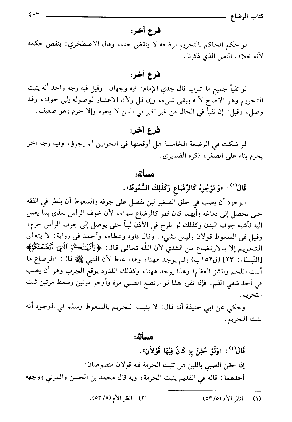 الوجود أن يصب في حلق الصغير لبن يفصل على جوفه والسعوط أن يفطر في الفقه حتى يحصل إلى دماغه وأيهما كان فهو كالرضاع سواء، لأن خوف الرأس يغذي بما يصل إليه فأشبه جوف البدن وكذلك لو طرح في الأذن لبنًا حتى يوصل إلى جوف الرأس حرم، وقيل في السعوط قولان وليس بشيء. وقال داود وعطاء، وأحمد في رواية: لا يتعلق التحريم إلا بالارتضاع من الثدي لأن الله تعالى قال: {وَأُمَّهَاتُكُمُ الَّلاتِي أَرْضَعْنَكُمْ} [النساء: 23] [ق 152 ب] ولم يوجد ههنا، وهذا غلط لأن النبي صلى الله عليه وسلم قال: "الرضاع ما أنبت اللحم وأنشز العظم" وهذا يوجد ههنا، وكذلك اللدود يوقع الجرب وهو أن يصب في أحد شفي الفم. فإذا تقرر هذا لو ارتضع الصبي مرة وأوجر مرتين وسعط مرتين ثبت التحريم.