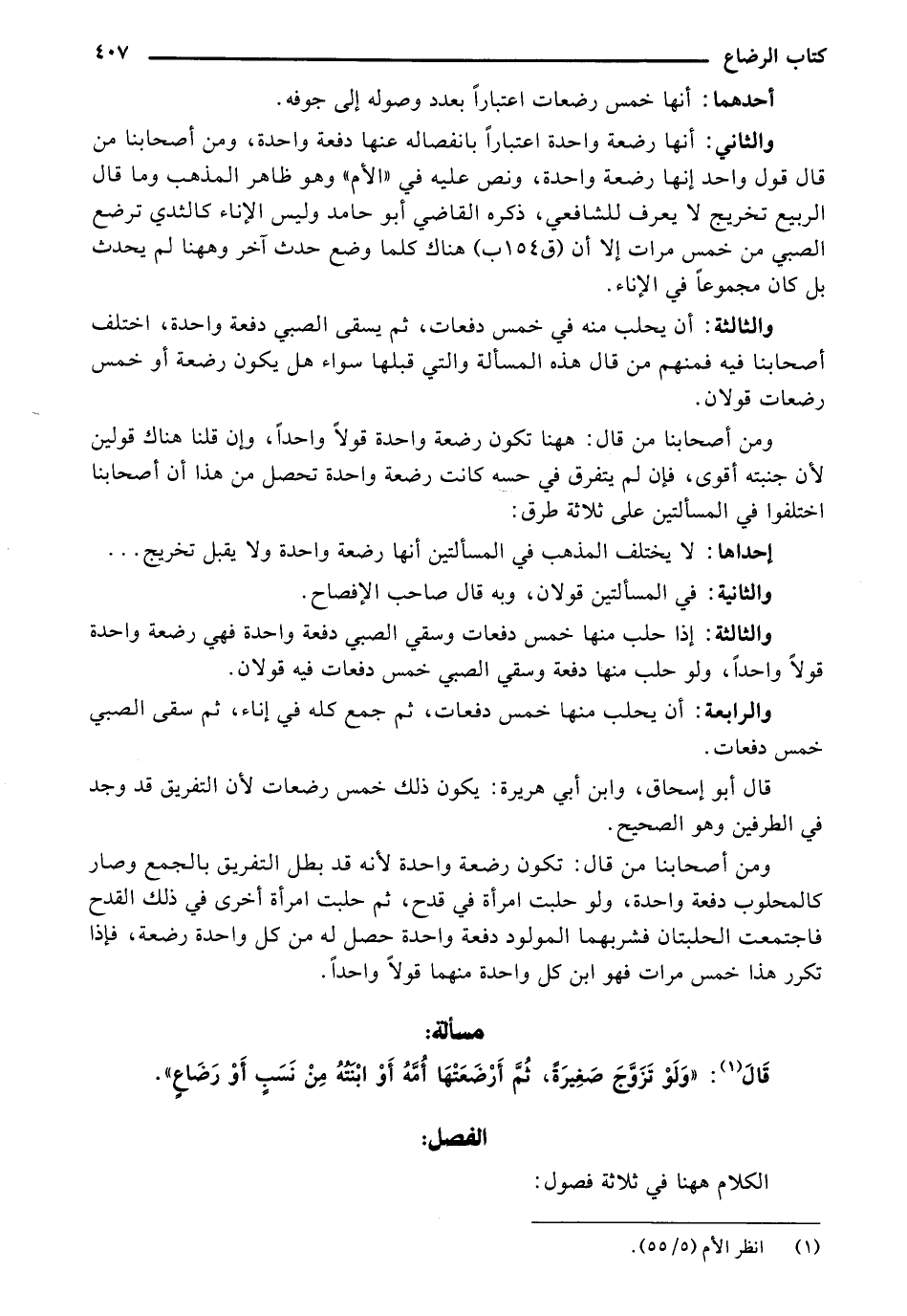 والثالثة: أن يحلب منه خمس دفعات، ثم يسقى الصبي دفعة واحدة، اختلف أصحابنا فيه فمنهم من قال هذه المسألة والتي قبلها سواء هل يكون رضعة أو خمس رضعات قولان.